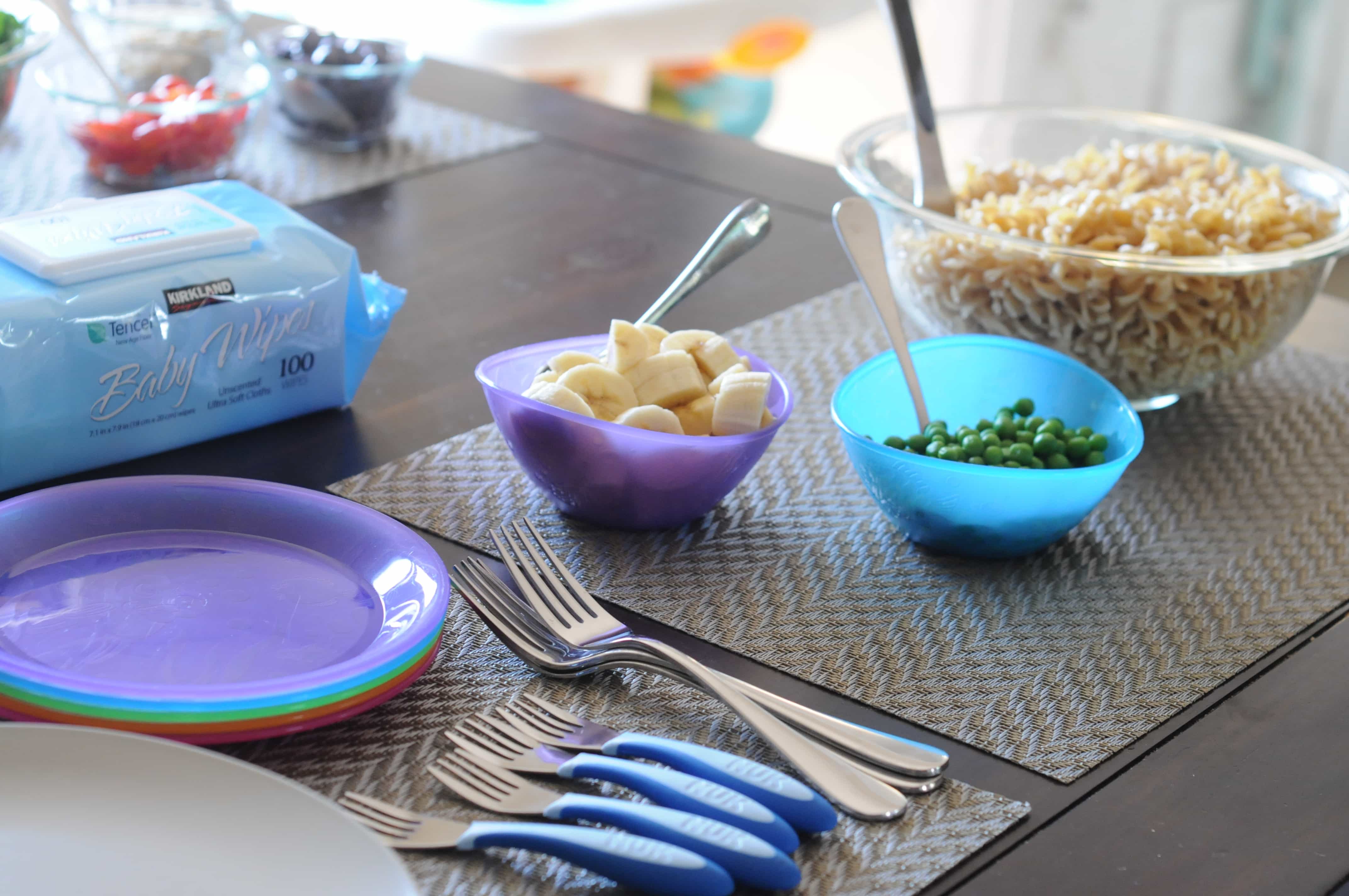 I set up a buffet so that the moms could make plates for their own kids, as well as themselves. I offered a bowl of green peas (one of David’s favorites) and bananas. I made a big bowl of whole wheat pasta (I like Whole Foods’ 365 brand…good price and organic!) and I drizzled it with a bit of olive oil.