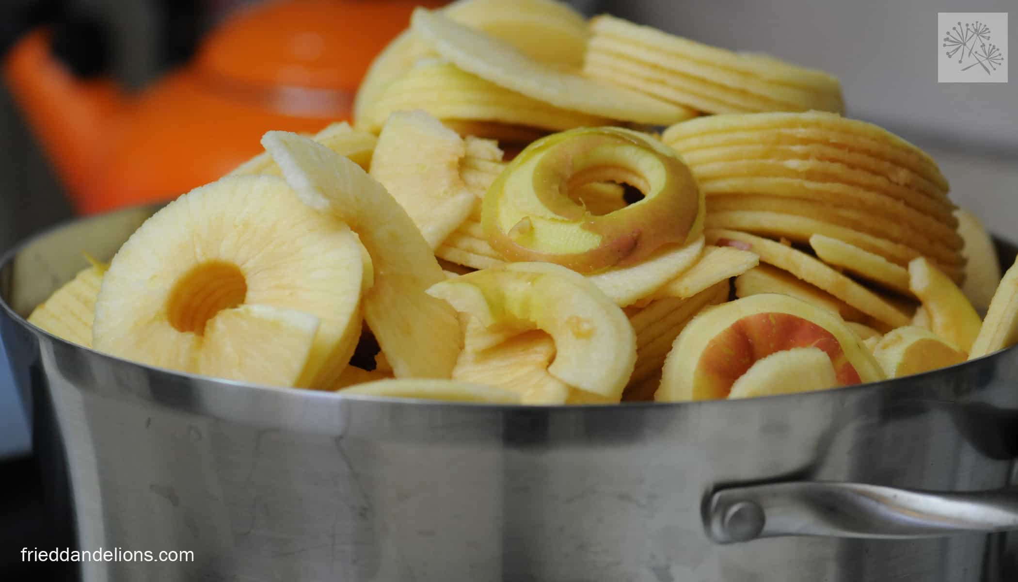 - Peel, core, and slice apples. I use a gadget like this one, which cuts the work time way down! Don’t worry if you have some peel on the apples, it’s just a texture preference (and the peel contains lots of healthy nutrients!). You could leave the peel on completely if you want even, just make sure to get rid of the core and seeds. Put apples into a large pot (I use a 6 ½ quart pot for 13 pounds of apples). Once you have about a third of the apples cut, turn the heat on to medium. Keep adding apples until you have a mountain of them—they cook down significantly so pile them on.