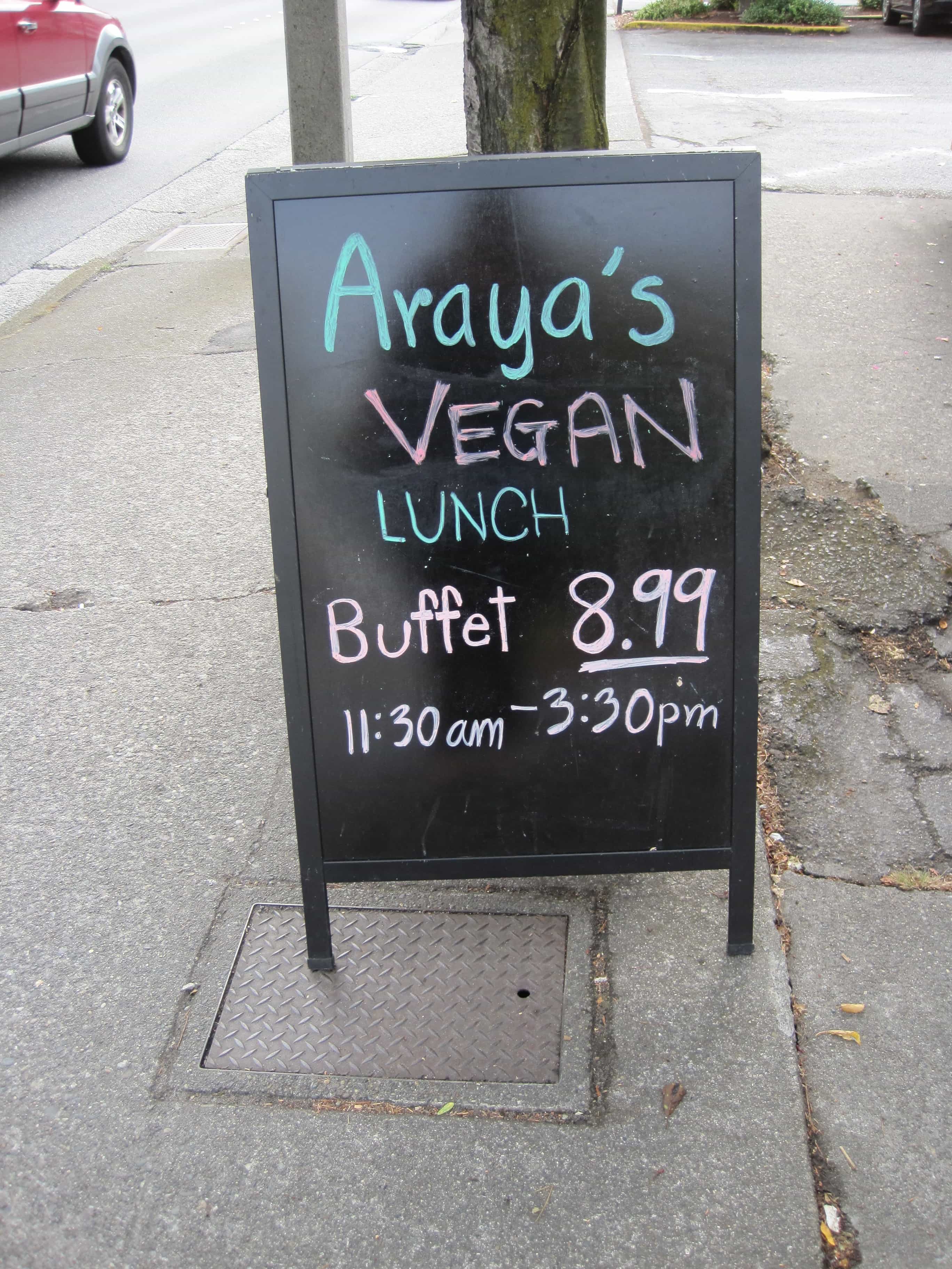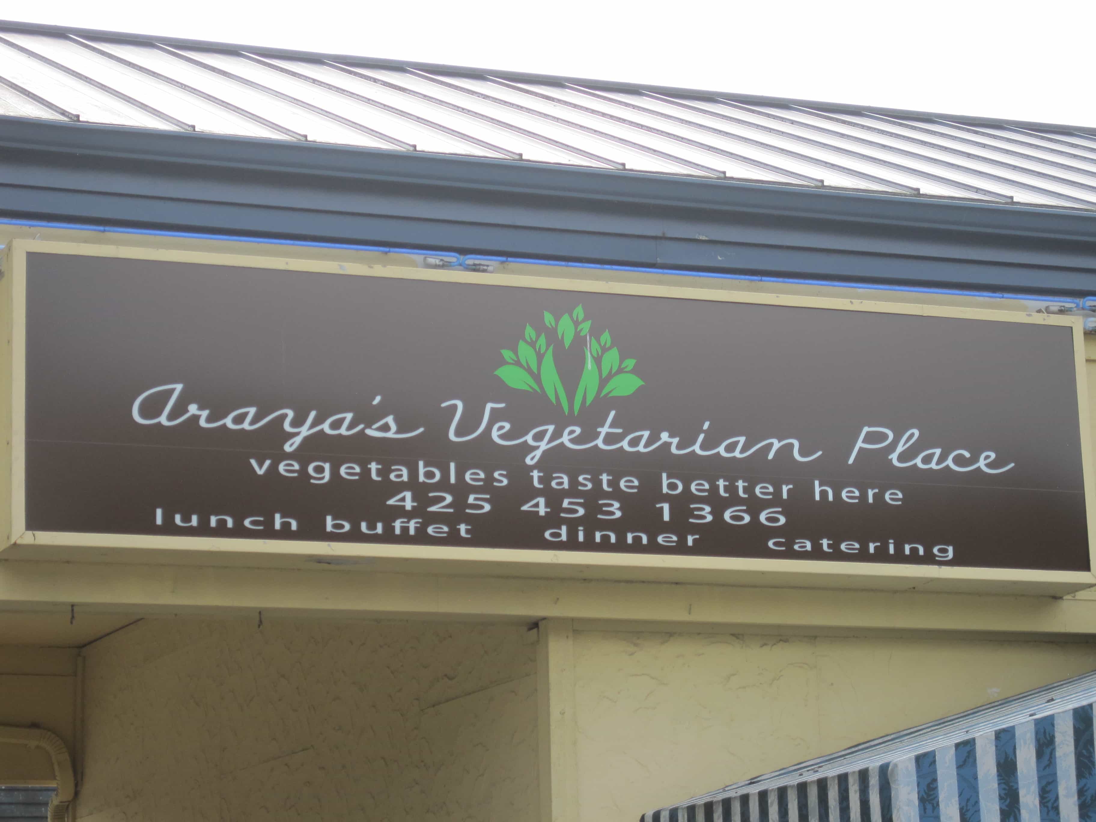 Last Saturday Irving, David and I went to Araya’s Vegetarian Place for lunch. Araya’s is an all vegan Thai restaurant. They have two locations, and we went to the Seattle location about 2 years ago. But with the new toll on the bridge, and a toddler in tow, we don’t get across the water as often as we would like. So I was thrilled when I saw that they had opened a new location in Bellevue. And I was even more thrilled when I saw this sign in front of the restaurant: