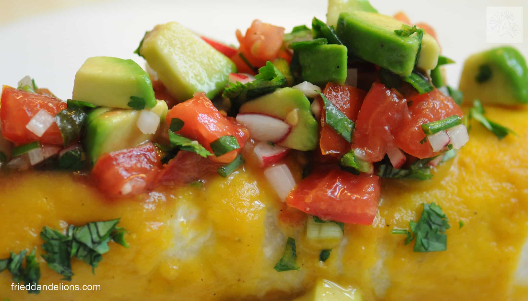 Bake in a 400 degree oven for 10-15 minutes to allow flavors to come together. Serve with a scoop of fresh pico de gallo salsa on top. We used a mix of radish, tomato, avocado, and cilantro tossed with lime juice and salt. Delicious!