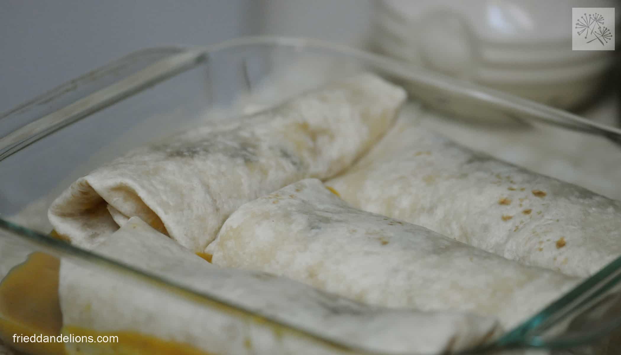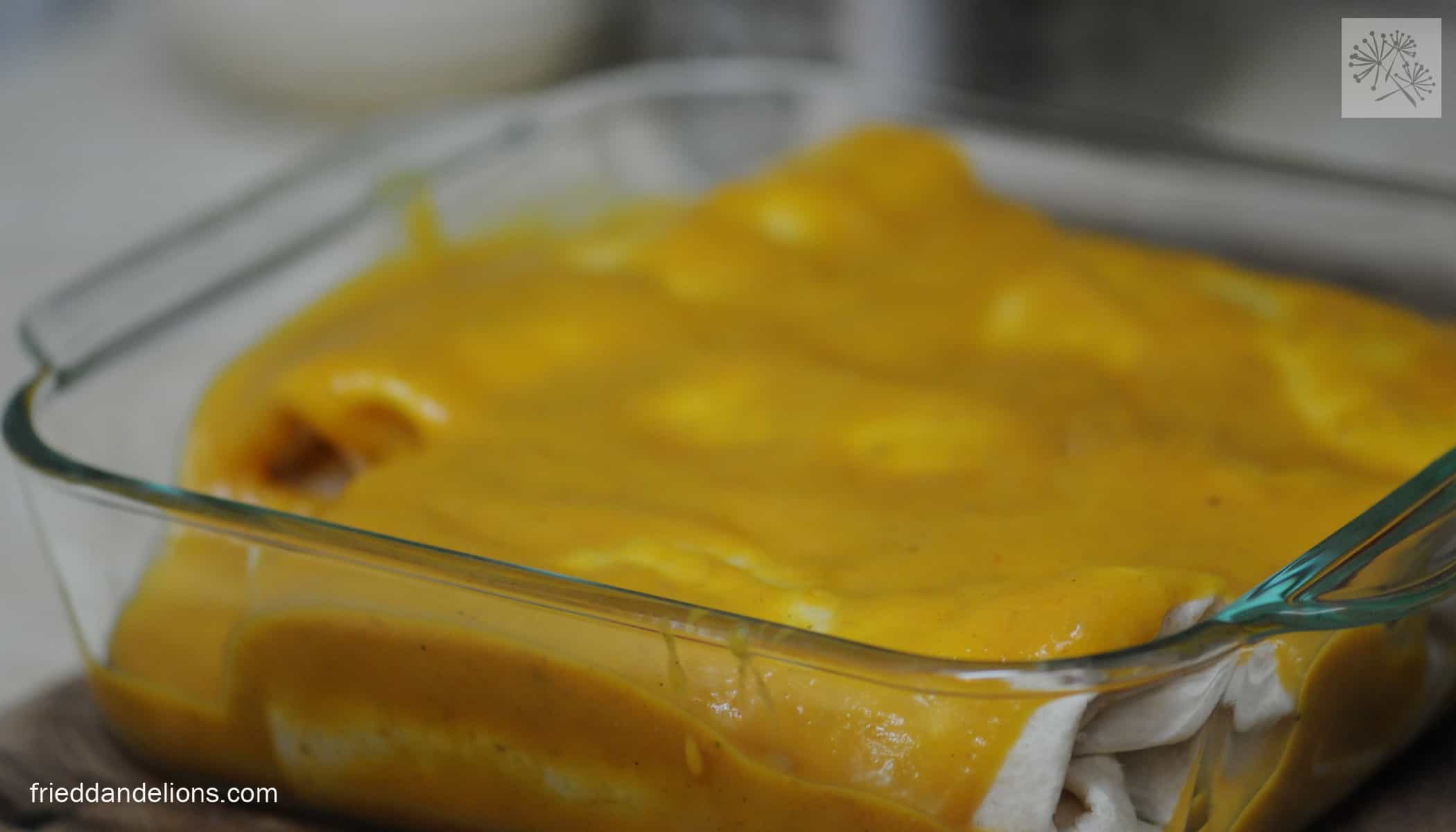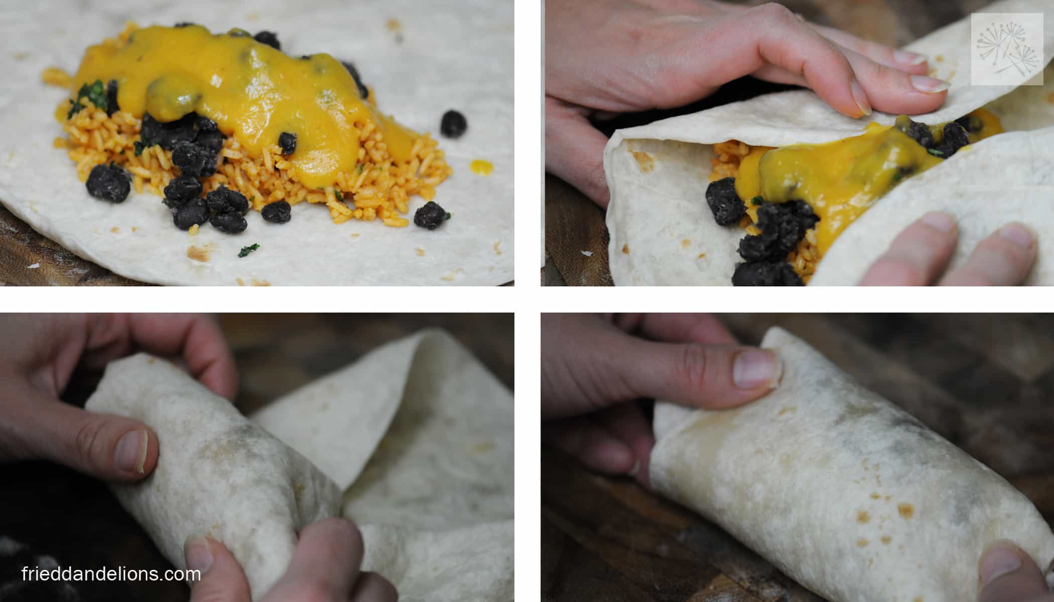 Pour a cup of carrot sauce on the bottom of a large baking dish. Place a scoop of rice and beans on the close side of a tortilla. Place a few tablespoons of sauce on top of the rice and beans. Fold each side in towards the middle (should go about half way). Roll the burrito, using your hands to keep the edges folded in.