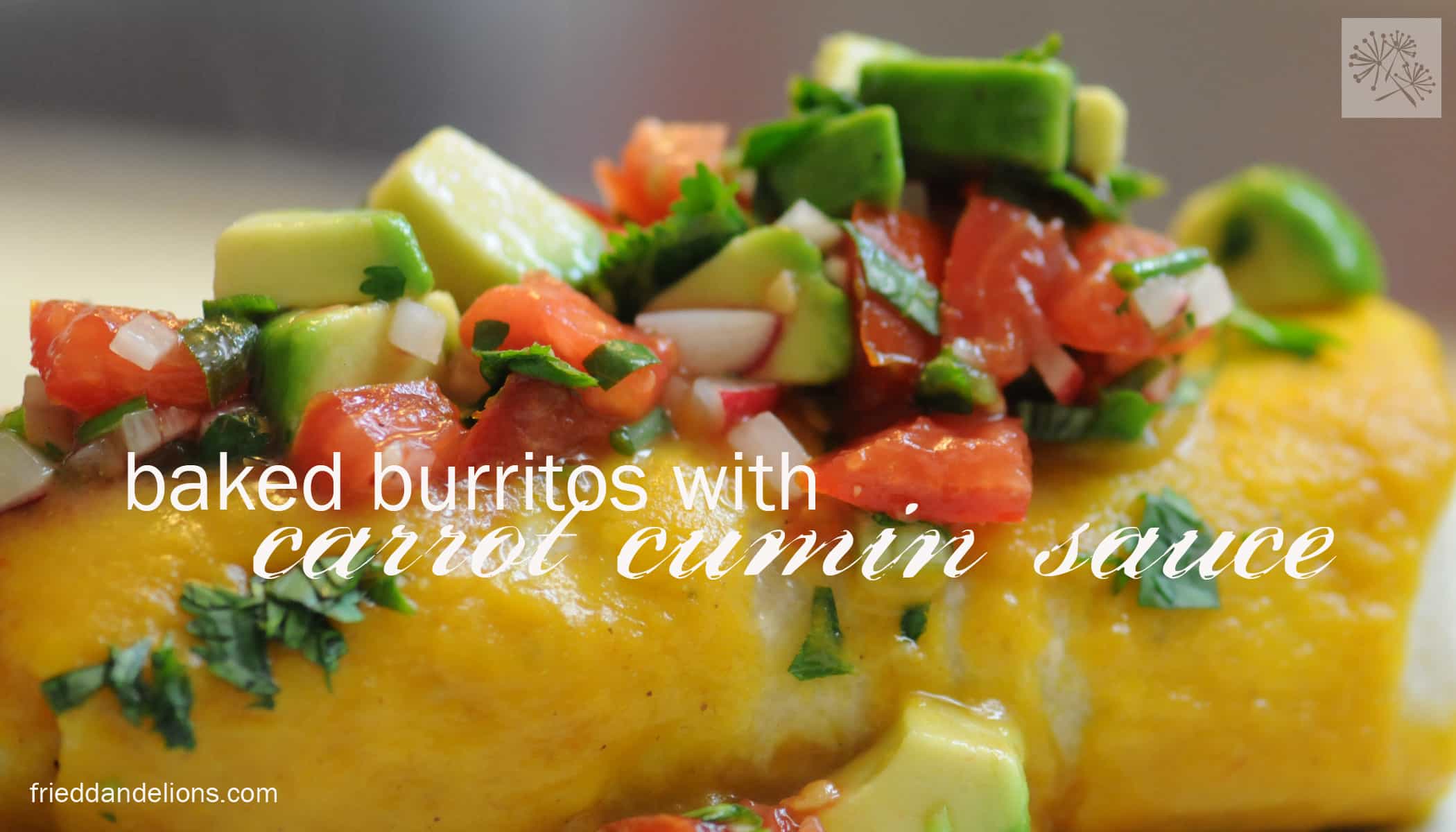Last weekend I got to play sous chef while Irving did the bulk of the cooking—we made burritos filled with his Mexican styled rice (tomato paste, onions, garlic powder), black beans, and fresh homemade salsa! And what was I in charge of besides chopping? I made a yummy carrot cumin sauce that went both inside and on top of the burritos!