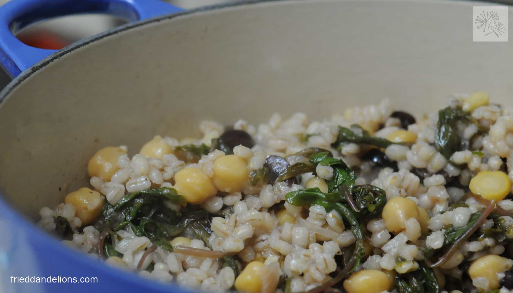 When barley is mostly cooked (within a minute or two of being done) add the kale on top and give it a quick stir. Cover again and let sit for about 5 minutes, allowing the kale to wilt. It will seem like you have WAY too much, but you don’t. Remove lid and add the garbanzo mixture. Pour the dressing on top and give it a good stir. Allow it to cook for about 5 more minutes over low heat allowing all of the flavors to meld together.
