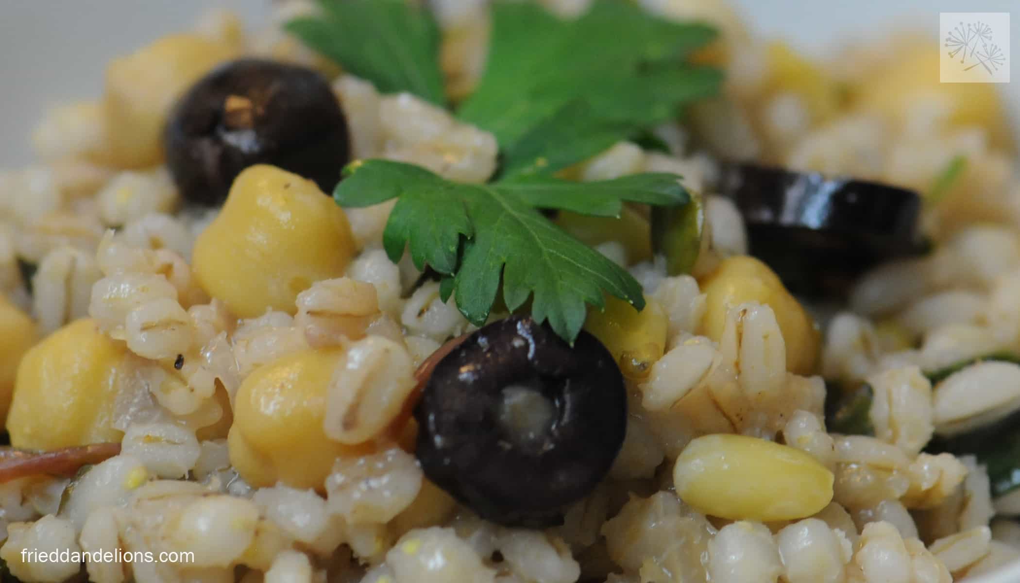 Bring 3 c water to a boil in a pot that is bigger than what you need for just the barley. Add barley to boiling water with a tablespoon of salt and bring back up to boil. Lower to a simmer and cover. Let cook for about 35-45 minutes, until barley is tender and most of the liquid is absorbed.