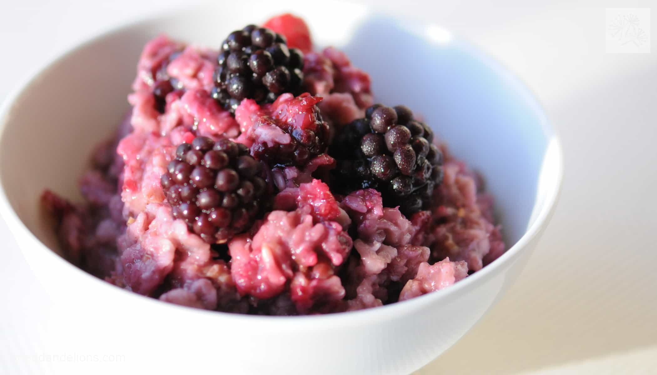 The latest version we’ve come up with is Berry Oatmeal. I have bags of frozen berries from the summer farmer’s markets in my freezer taking up more space than I have, so we’ve started using them up. They turn the oatmeal into a beautiful bright pink color—I feel like this would be a perfect Valentine’s Day breakfast! I would hardly call this a recipe, but here’s how I make it: