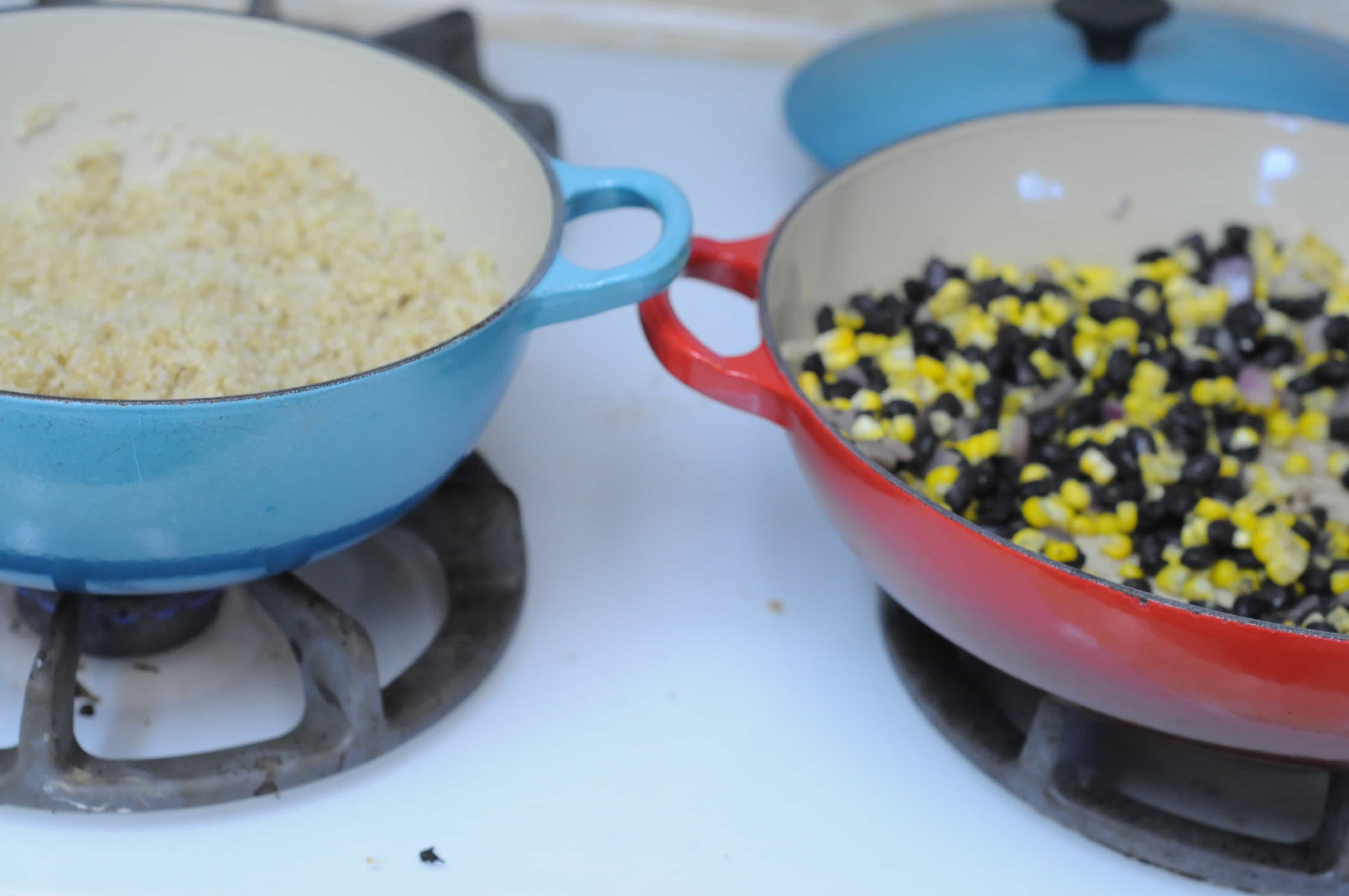 Prepare Quinoa according to package directions, making sure to rinse first! I find that 1 ¾ cups of water to 1 cup of quinoa is the right ratio for me (slightly less water than the package directs). In a separate saute pan, sauté red onion in olive oil until it starts to brown. Add black beans and fresh corn. Sprinkle with adobo or salt and pepper. When quinoa is cooked, add black bean mix on top and stir gently to combine. Set aside.