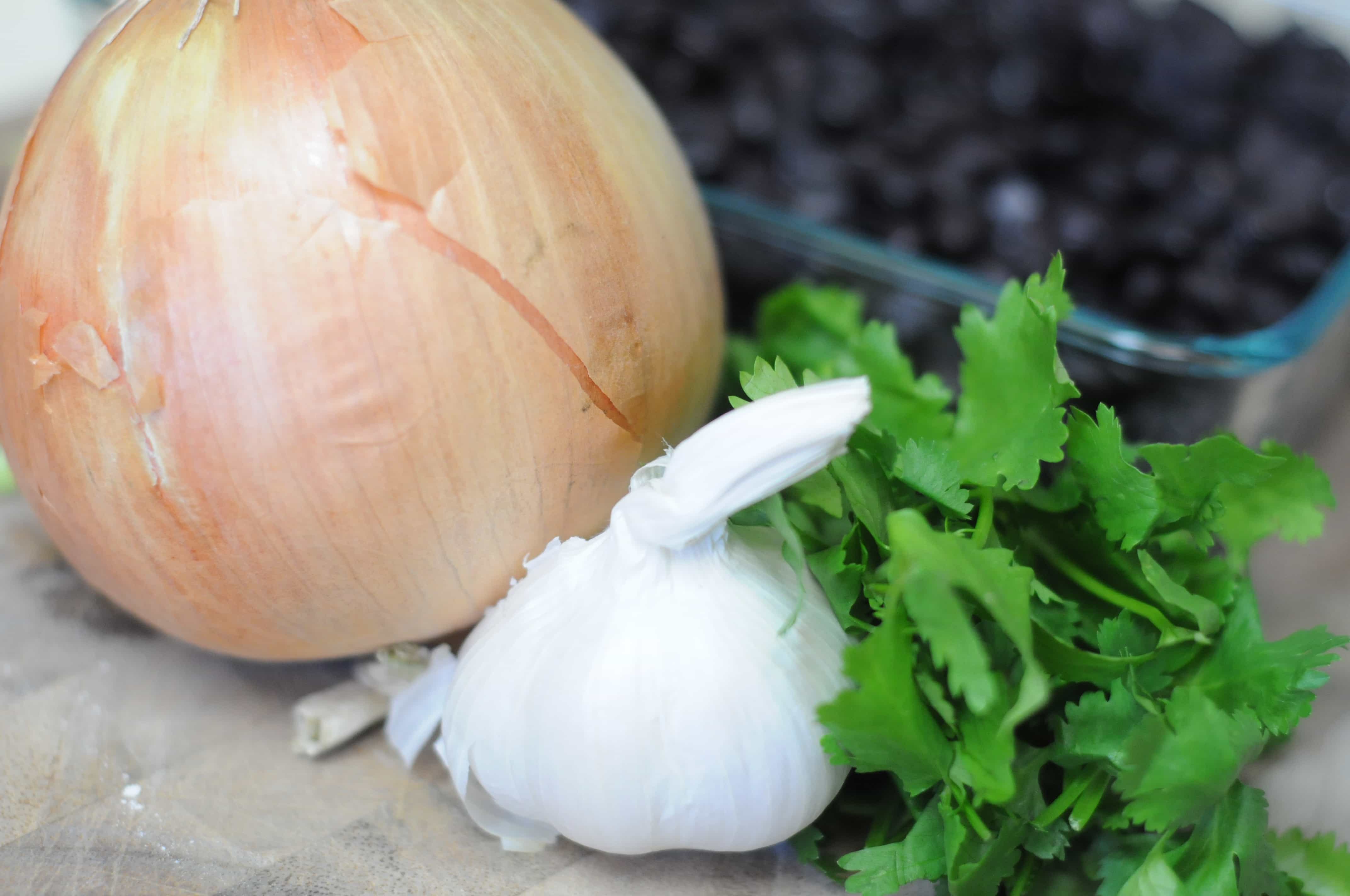 Heat olive oil in small saucepan. Dice half of an onion and add to oil and brown (or semi blacken as I did tonight…no worries, it all worked out). Add garlic and brown for a minute more. Stir in oregano, cumin, salt and cilantro and give it a good stir. Add water and deglaze any brown bits from the bottom of pan. Add beans and mix well. Lower heat and let simmer together while water evaporates.