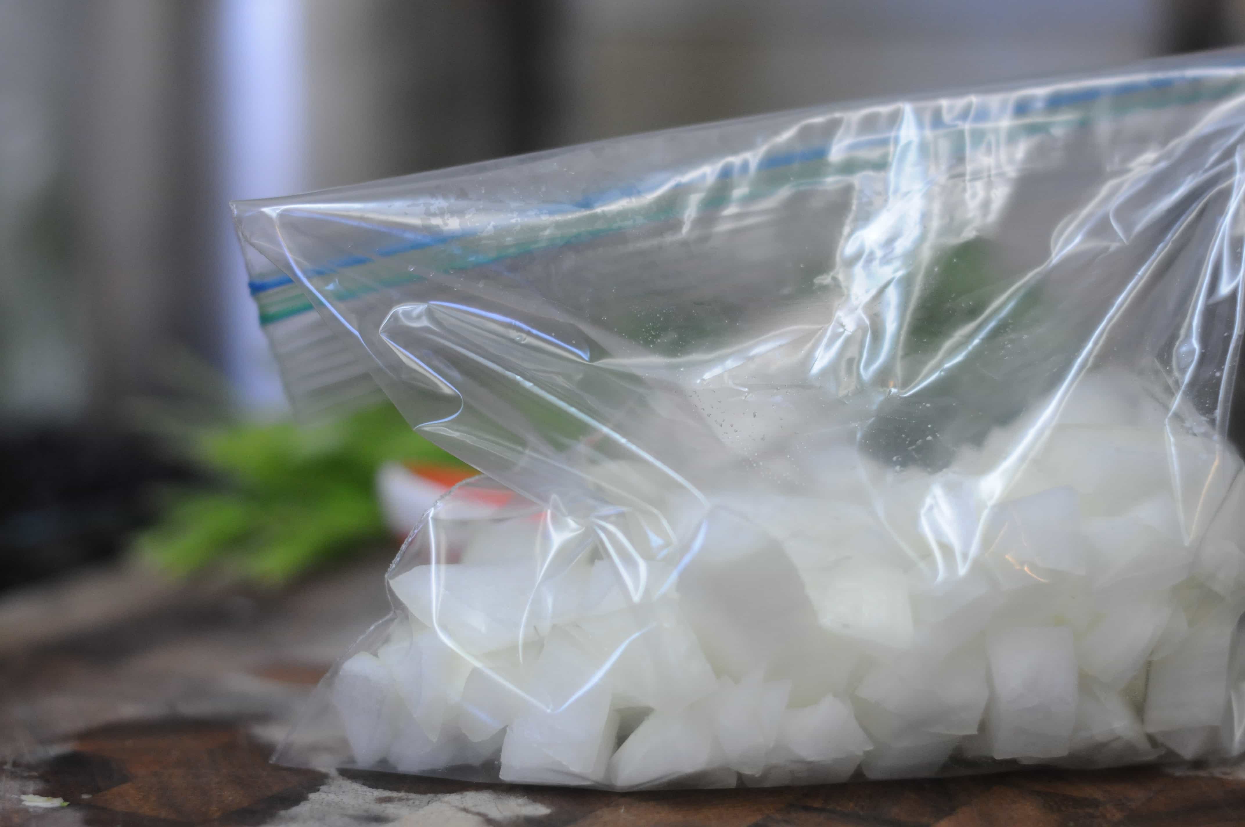 *Tip: dice the other half of the onion while you are in the chopping rhythm. Place in a zip top bag and freeze. Onions freeze fairly well, and work especially well in cooked dishes like soups and stews. Next time you need an onion you’ll be ready!