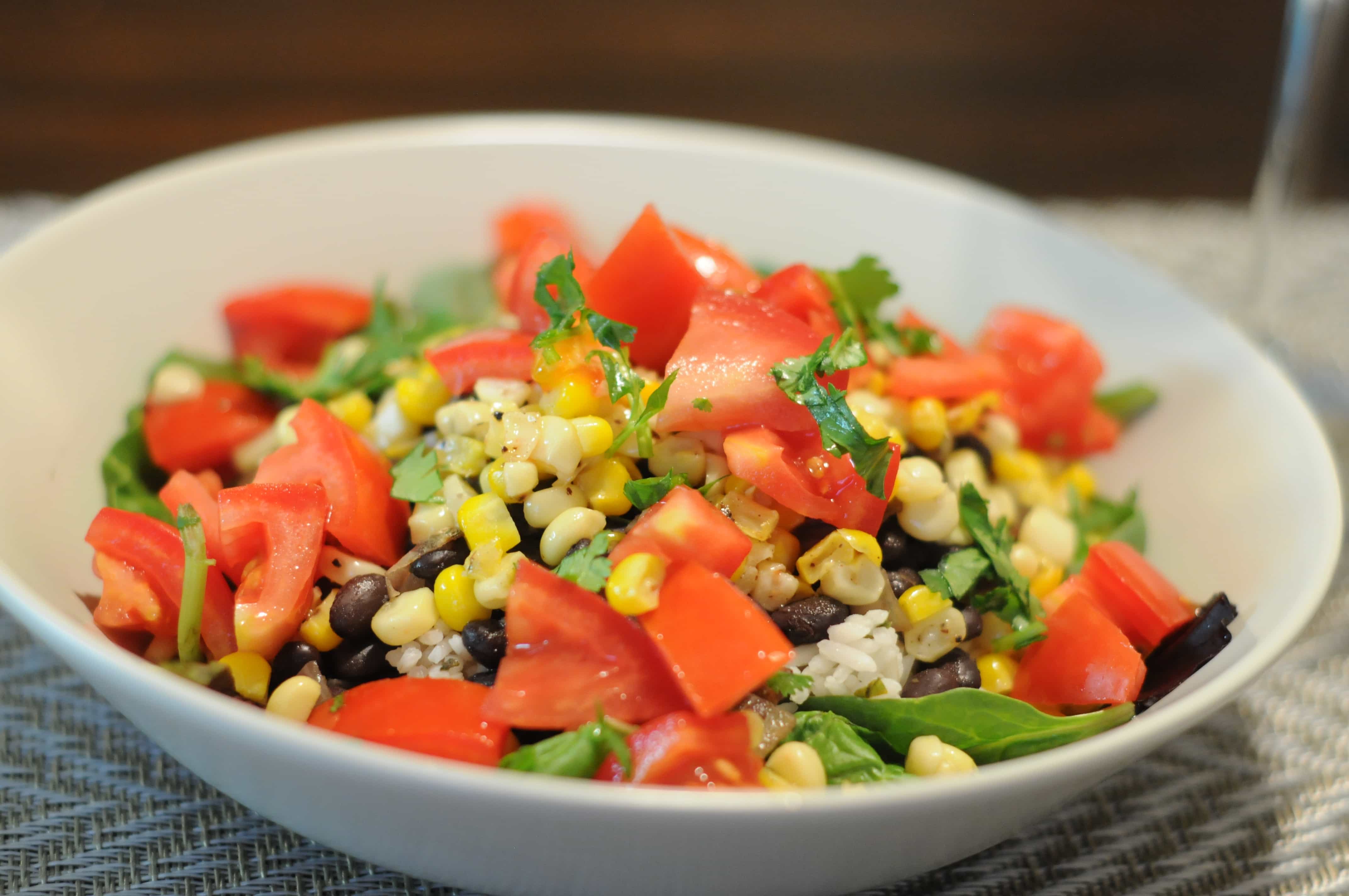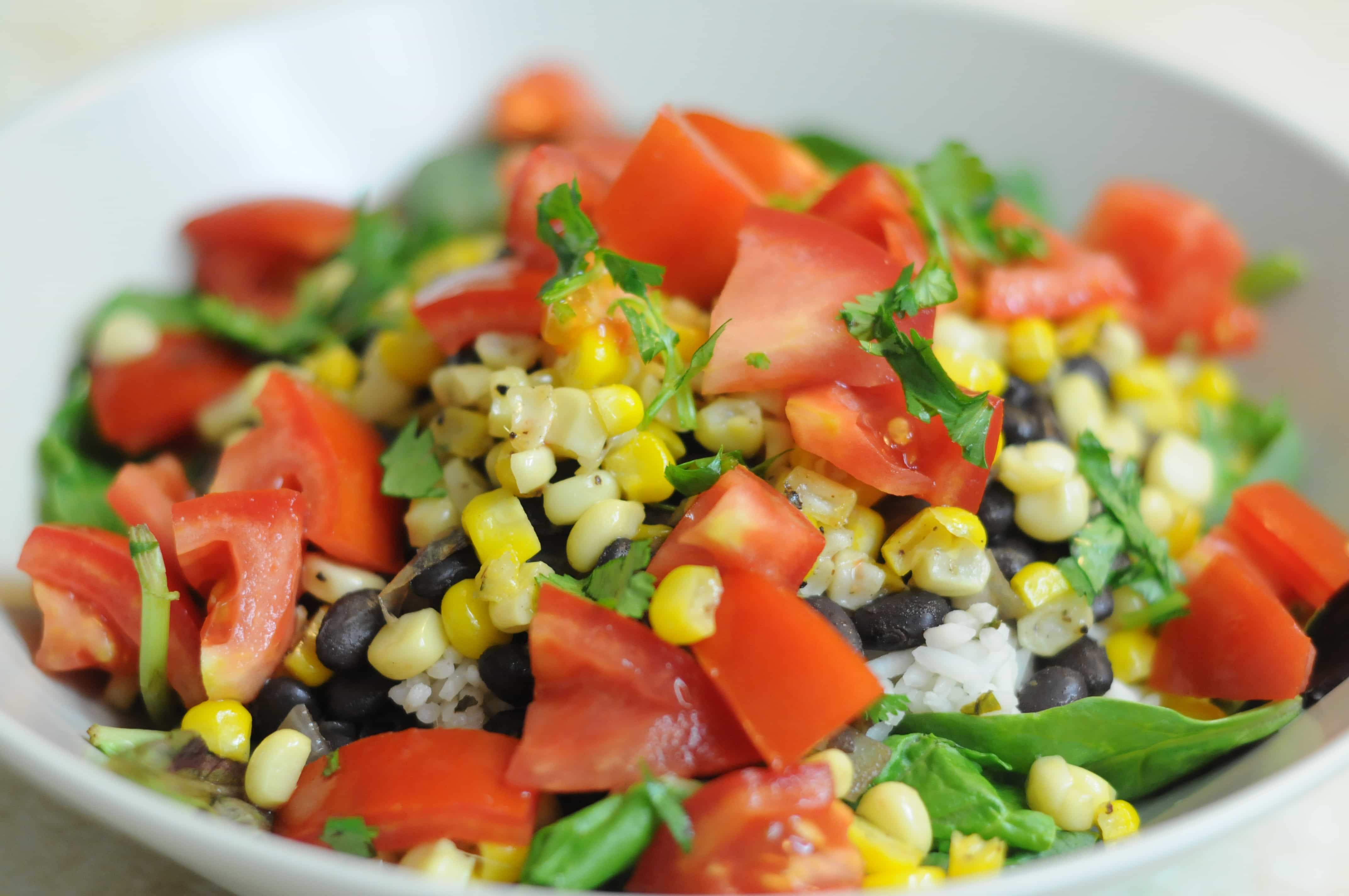 Place a bed of greens in the bottom of your bowl. Add a scoop of rice on top, followed by a scoop of beans, then corn, then tomatoes and cilantro to garnish. Dig in as fast as you can!