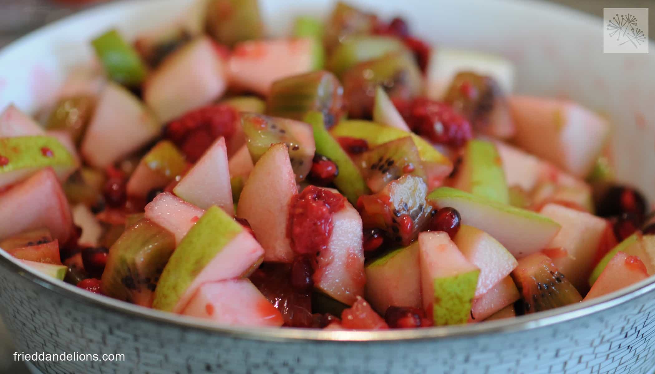Fruit—I made two fruit dishes. The first is a fruit salad. I read a suggestion in In Style Magazine once to use just one or two colors of fruit in a salad to make it look more sophisticated. Today I used all reds and greens, using kiwis, pears, blood oranges, raspberries, and pomegranate arils.