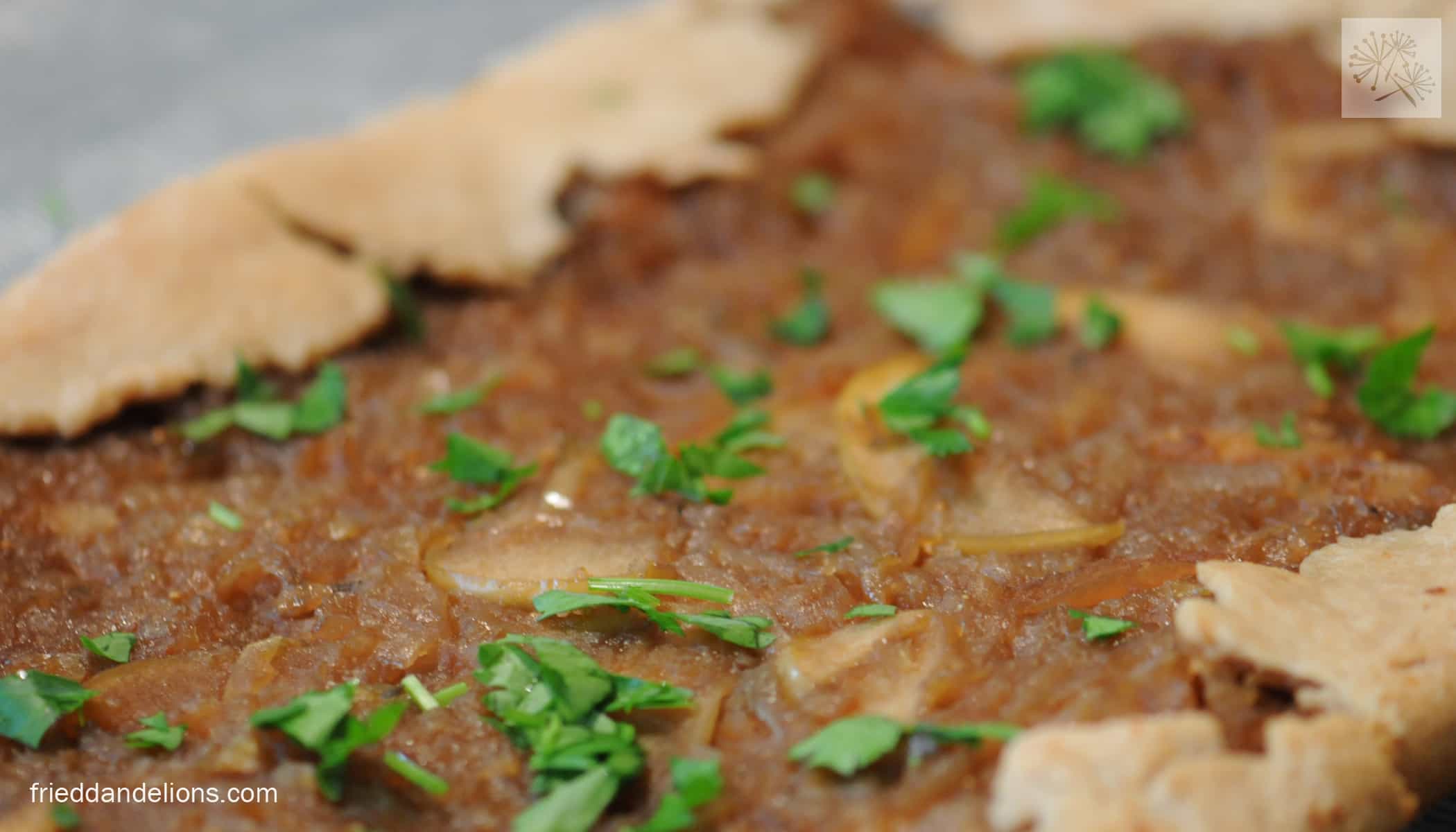 Apple Fig Onion Tart—this couldn’t be easier—caramelize 2 pounds of onions and 4 apples until very soft (about 30 minutes) in olive oil. Add a 1/4 tsp of dried thyme, 8 ounces of fig jam, and mix well. Pulse about half in a food processor and mix back with the rest. You will have the consistency of a chunky applesauce. Using your favorite pie crust (I made mine from the Veganomicon cookbook), spread filling in crust and bake at 400 for 30-40 minutes, until crust is brown and cooked and filling is warm. Garnish with parsley.