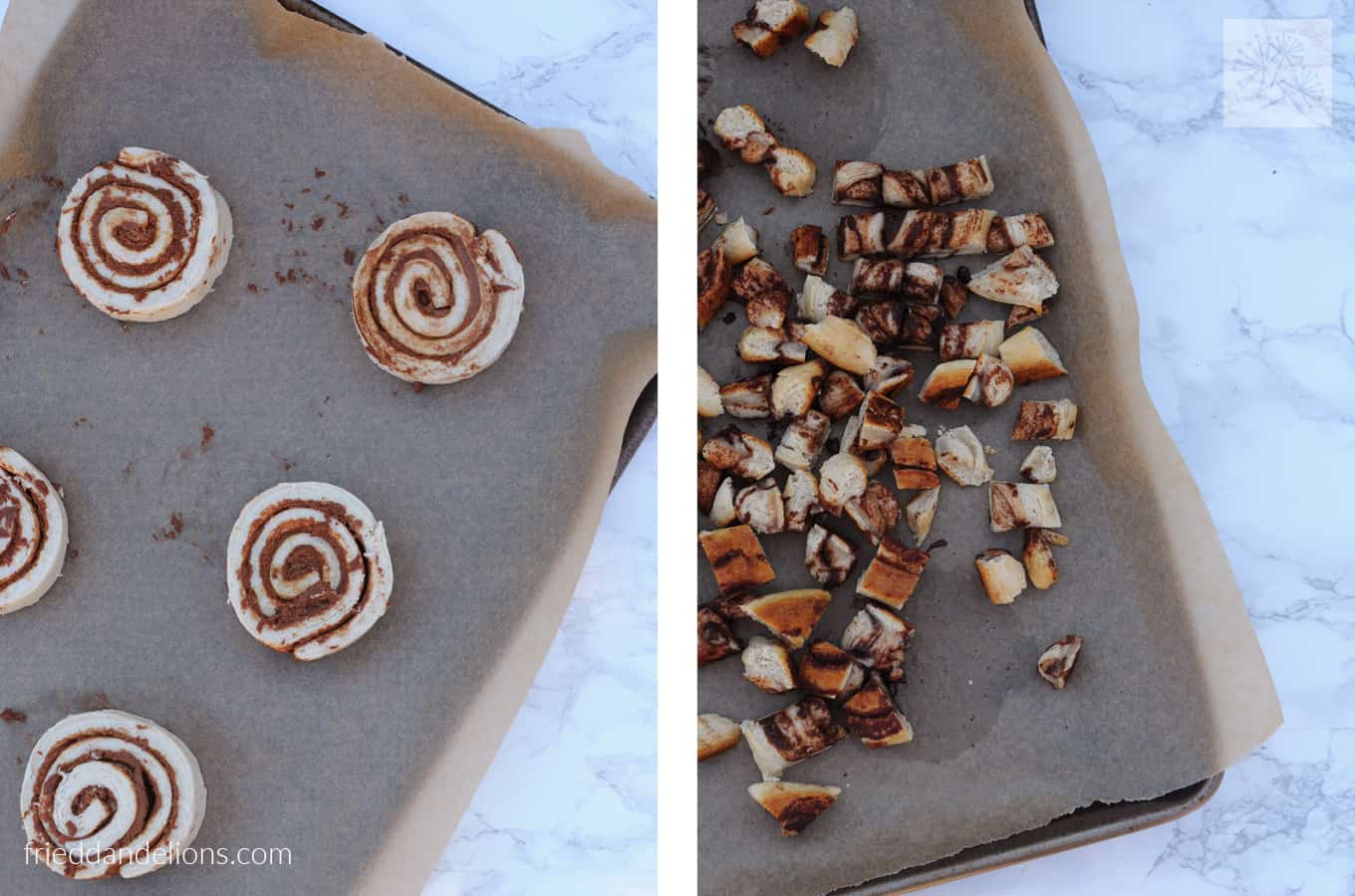 - Open the can of cinnamon rolls and arrange the rolls on a parchment lined baking sheet, allowing them to have a little bit of space. Bake for 15 minutes. Remove the pan from the oven and cut the cinnamon rolls into cubes (I cut each one into 4 strips in each direction).