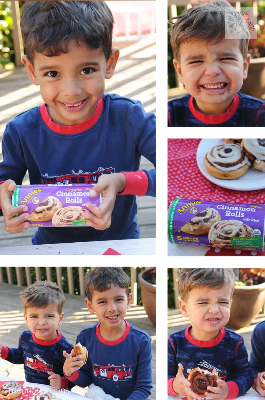 These Cinnamon Rolls are delicious! It’s been a while since I had one of these “whack and bake” tubes—I think many are accidentally vegan though—and it was really fun to hear that *POP* that I remembered as I opened the tube! As much as I would like to make everything from scratch, with two busy boys it’s just not practical all of the time, and I love that companies like Annie’s Homegrown have yummy organic options that are either premade or quick to prepare! Indulging in comfort food doesn’t have to mean compromising your standards! I always keep a stash of Annie’s Homegrown goodies in my purse for meltdowns when we go out—my boys love their treats!