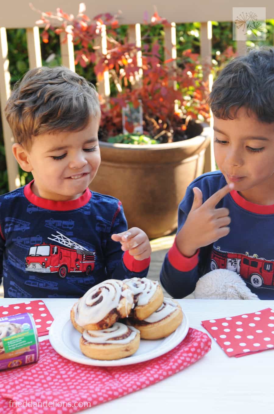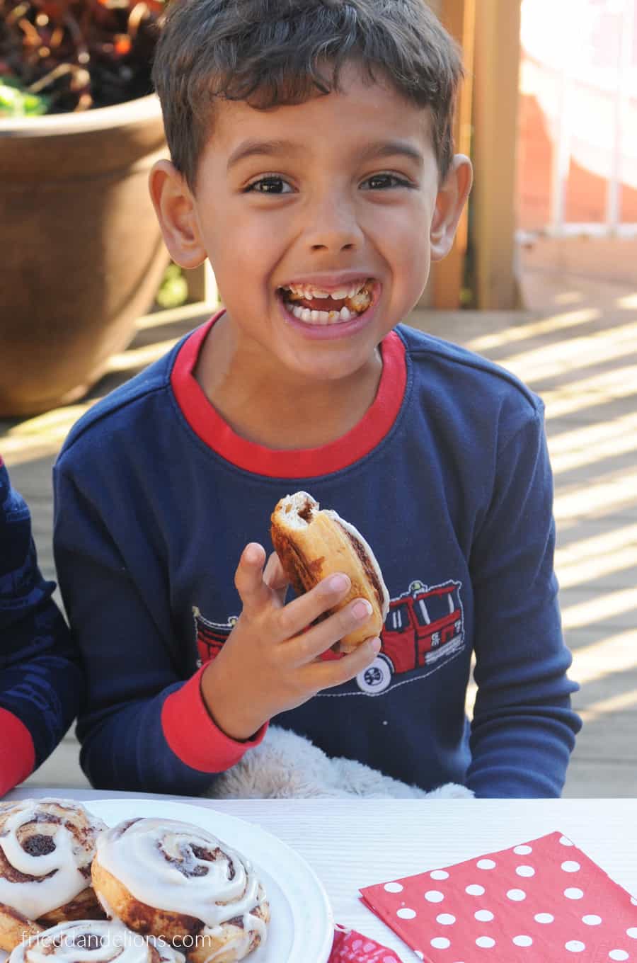 We popped these rolls into the oven and less than 20 minutes later we had cinnamon rolls! The boys were in heaven, using their fingers to scrape up every bit of frosting! They would be perfect for a frazzled morning when you don’t have time for anything—pop them in the oven and they’ll be done by the time you jump out of the shower. Breakfast that your kids will actually eat!