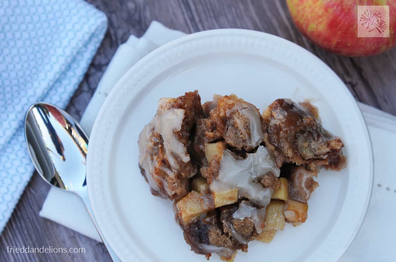 - Dice the apple and set aside while the cinnamon rolls soak. Spray a pie plate with cooking oil and set aside.