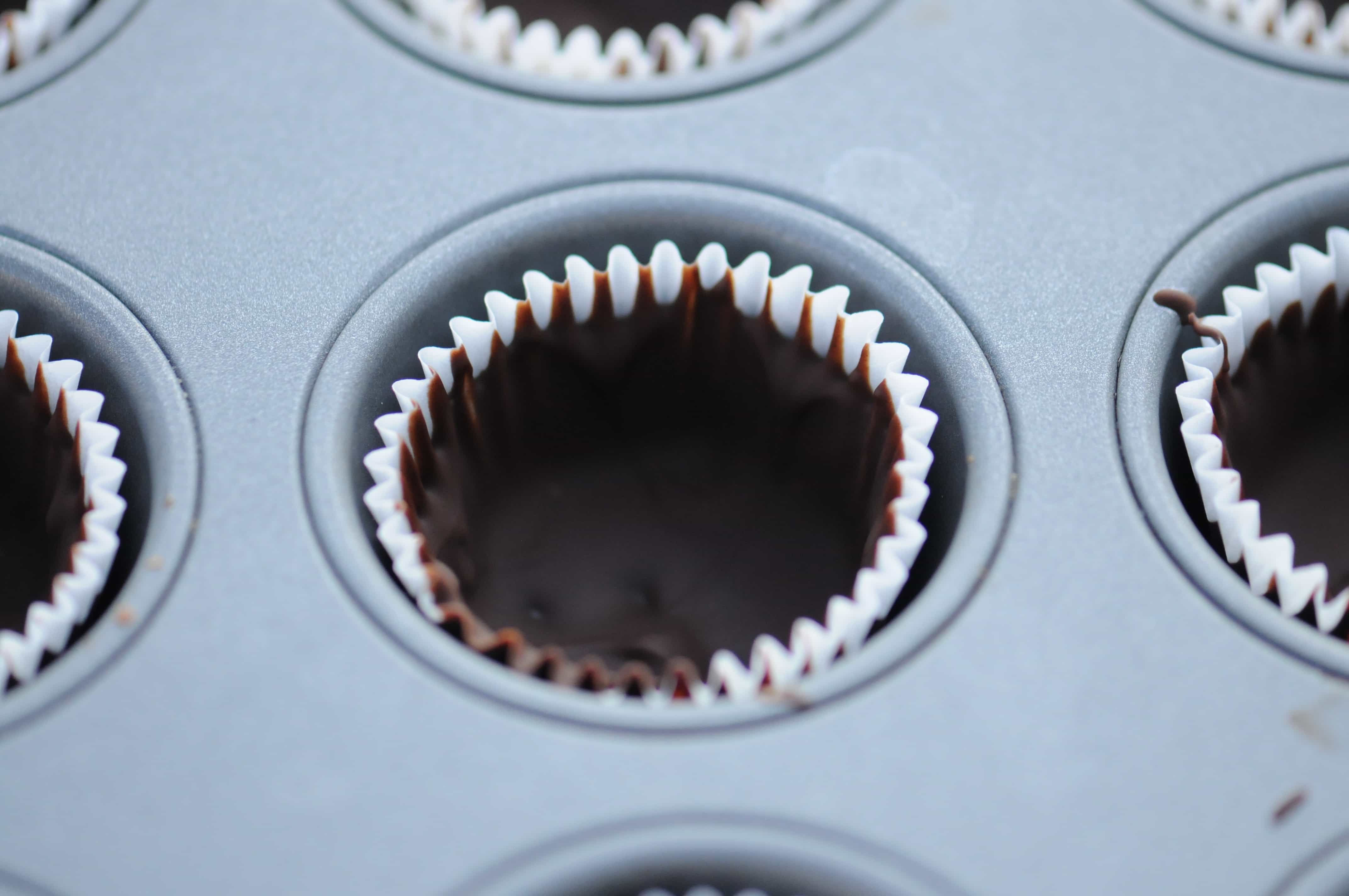 Once chocolate is melted, put about a teaspoon of chocolate into each cupcake paper. Then use the opposite end of a regular spoon to “paint” up the sides of the paper liners. If you end up with some of the paper showing through on the bottom, just add a little more chocolate. You want the bottoms to be solid enough to hold in the filling.