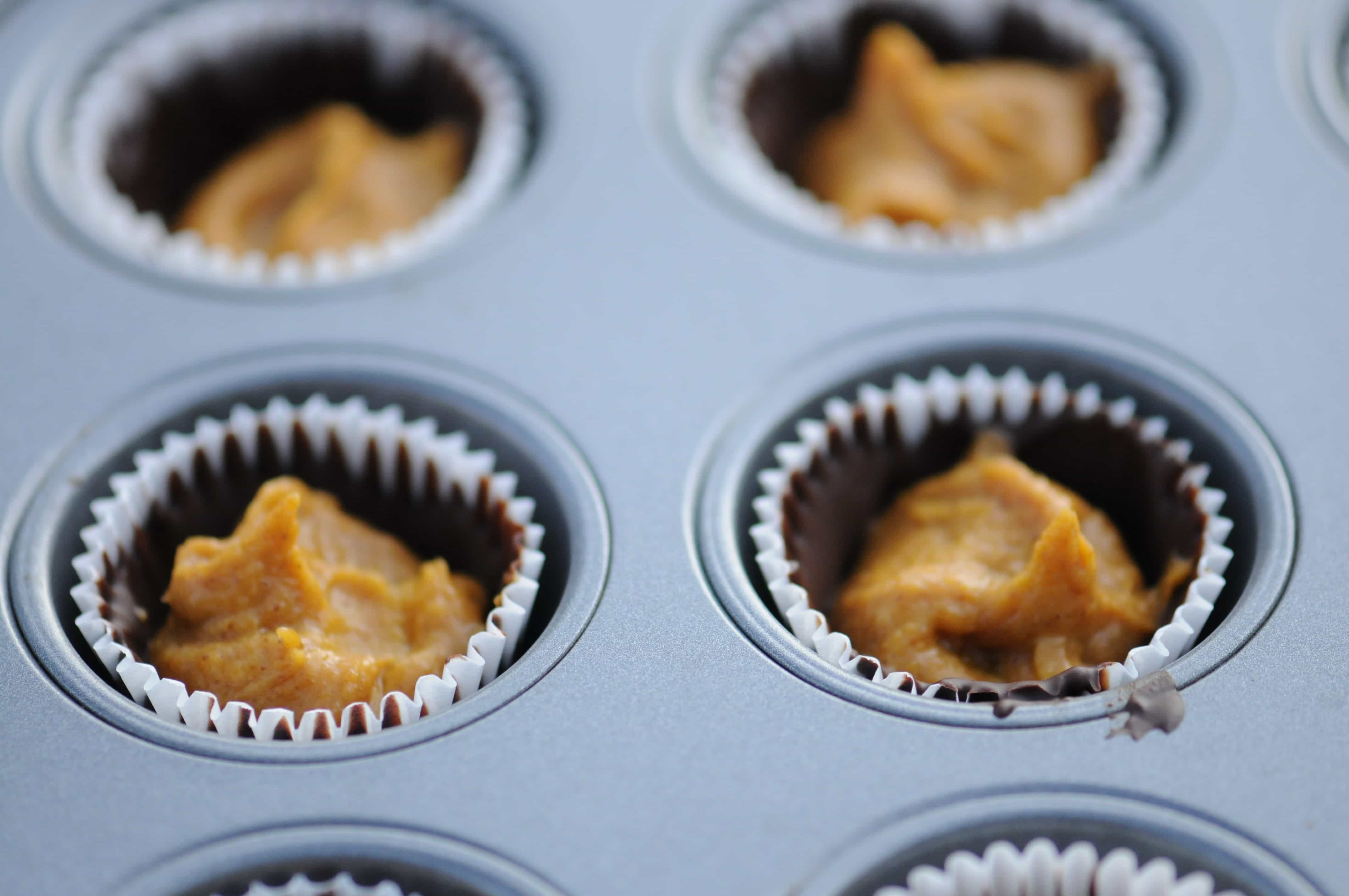 Once chocolate is hardened, place a small teaspoon of pumpkin peanut butter mix into each cup, leaving a tiny bit of space on top so that you have space for a chocolate “lid.”