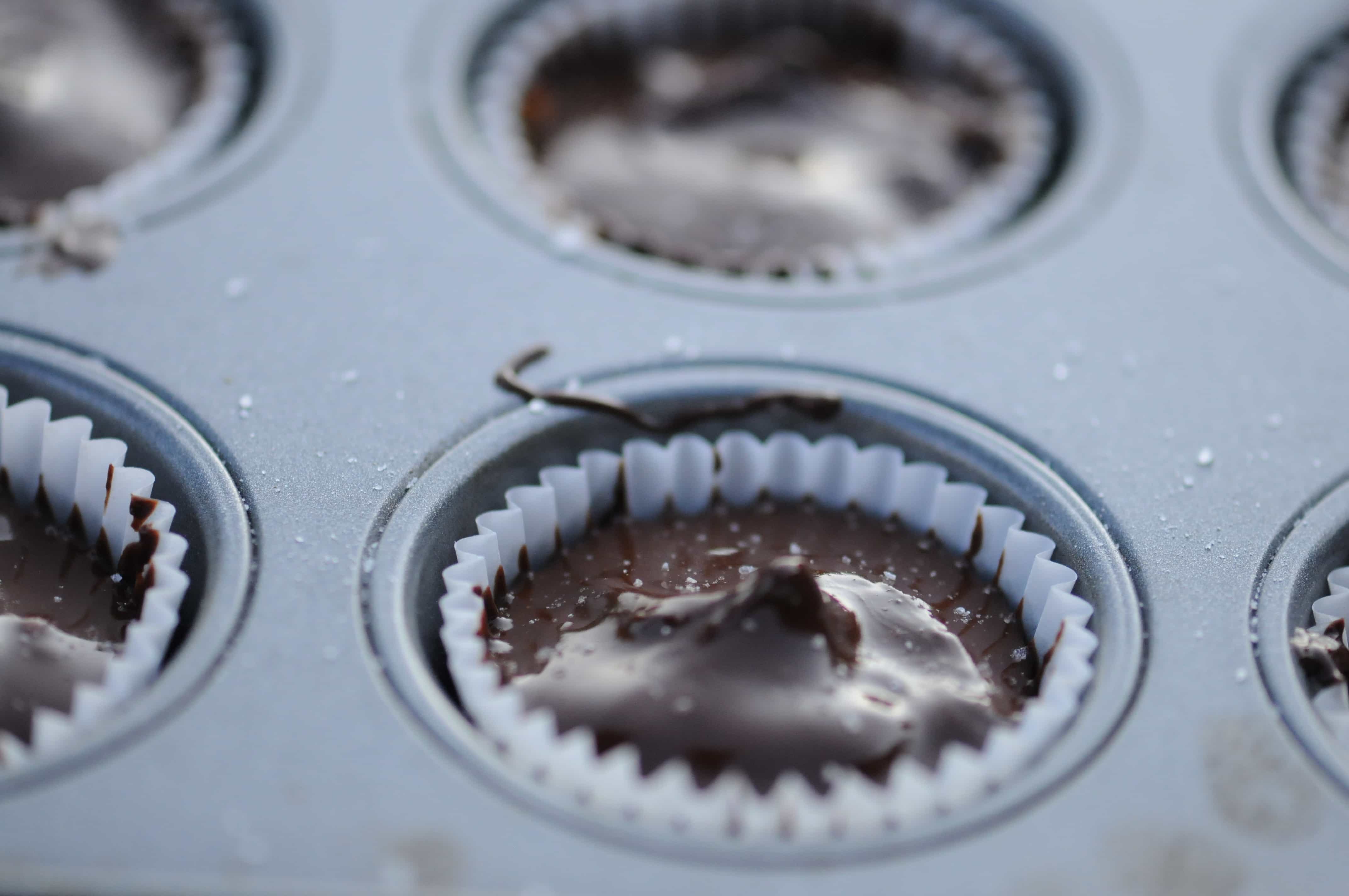 Then put a small amount of chocolate on top of each cup, using the spoon to push the chocolate gently to the edges to “seal” each cup. Sprinkle with sea salt and place back into the freezer. Let chill for about 10 minutes.