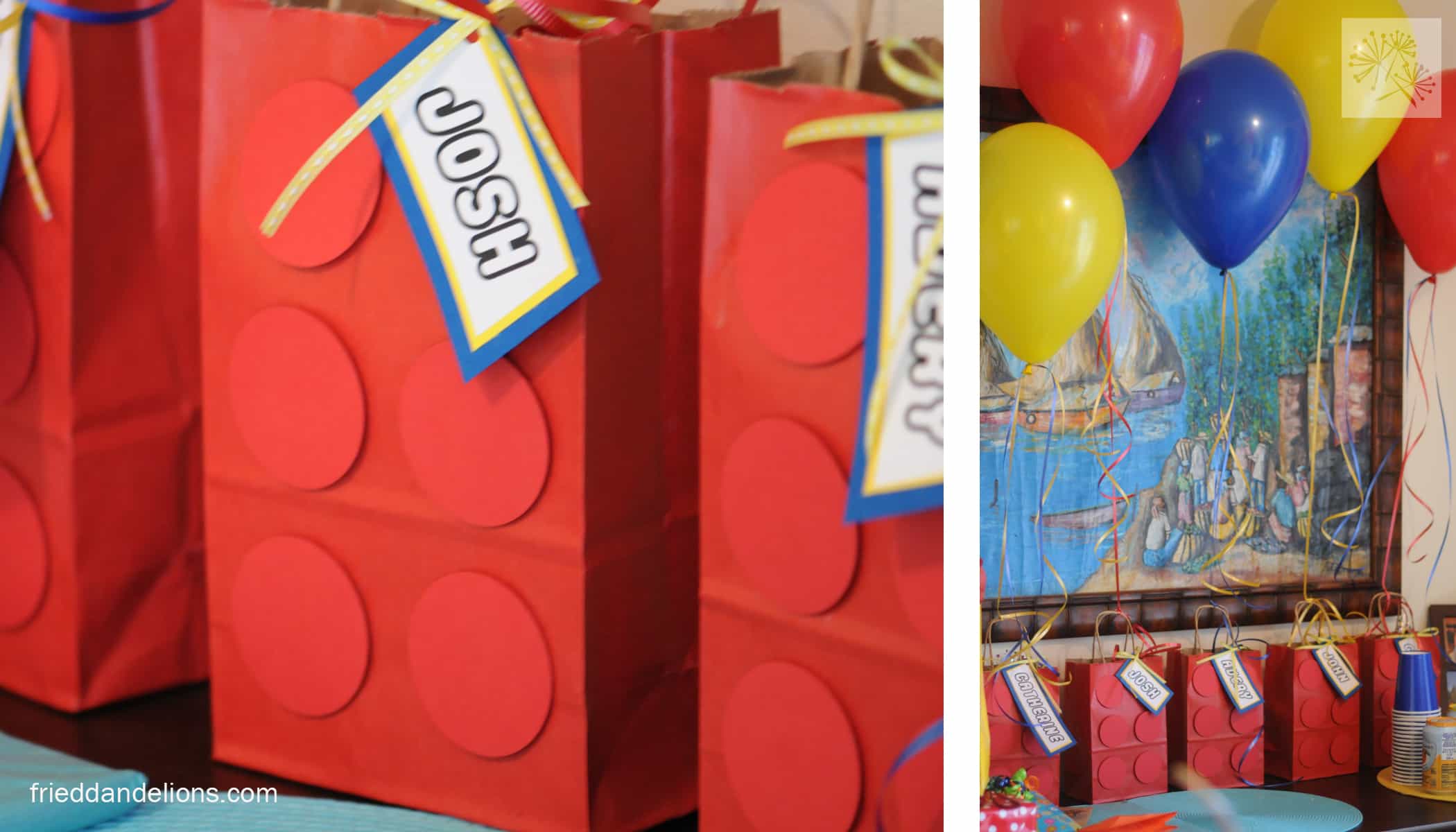 I had fun making party bags into giant Lego blocks. I just punched out six 2 inch circles for each bag and mounted them on the bags with little pieces of double sided foam squares to give them a little lift.