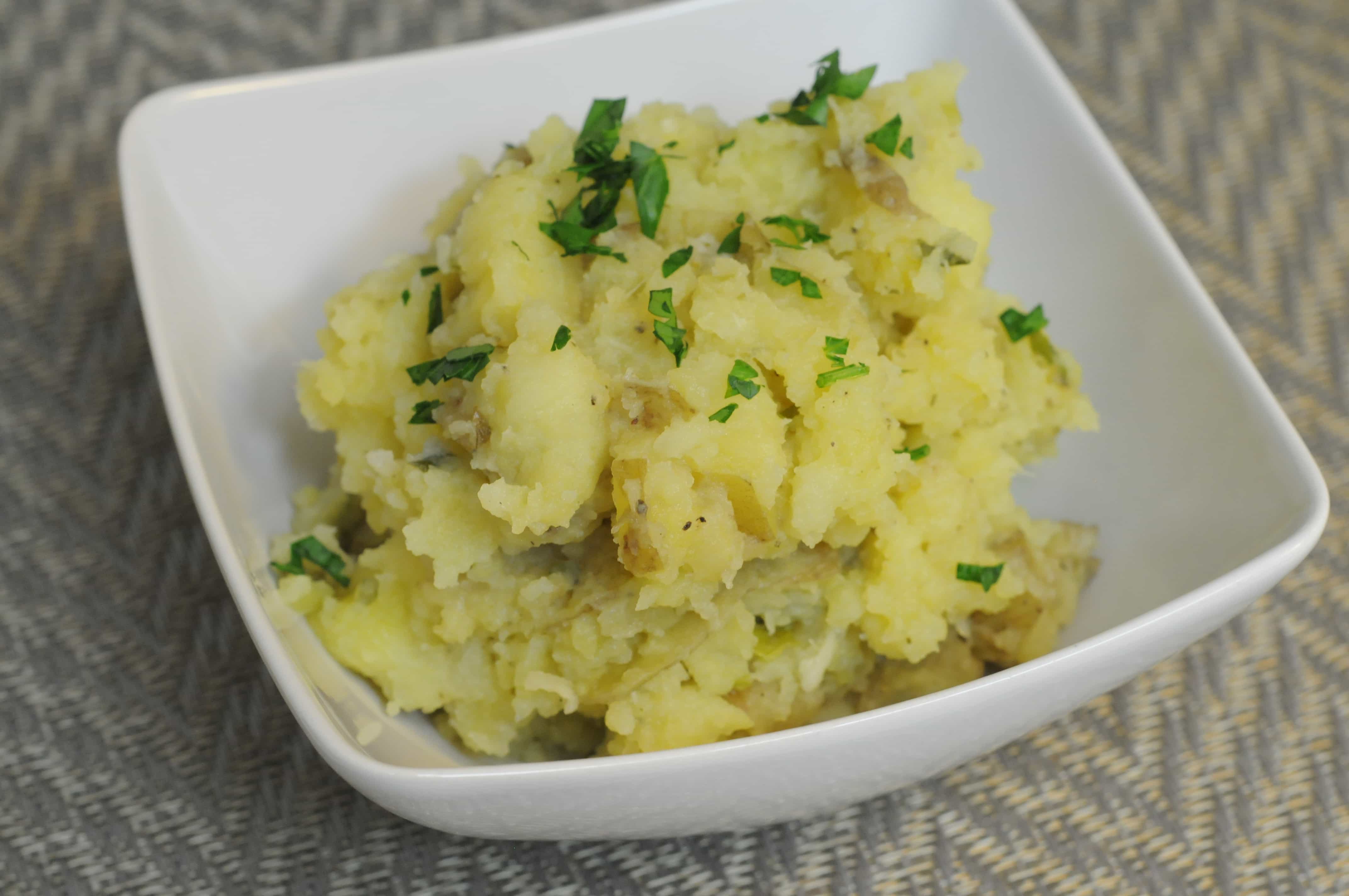 Put 1 T olive oil into pot and add green onions and roasted garlic (squeeze gently to release all cloves, and smoosh them into a paste). Add dried rosemary and stir. Let onion soften just a bit. Turn off heat and add potatoes. Use a potato masher and smash potatoes. Mix gently and well to incorporate herbs and garlic. Season with salt and pepper. Serve with your favorite dish!