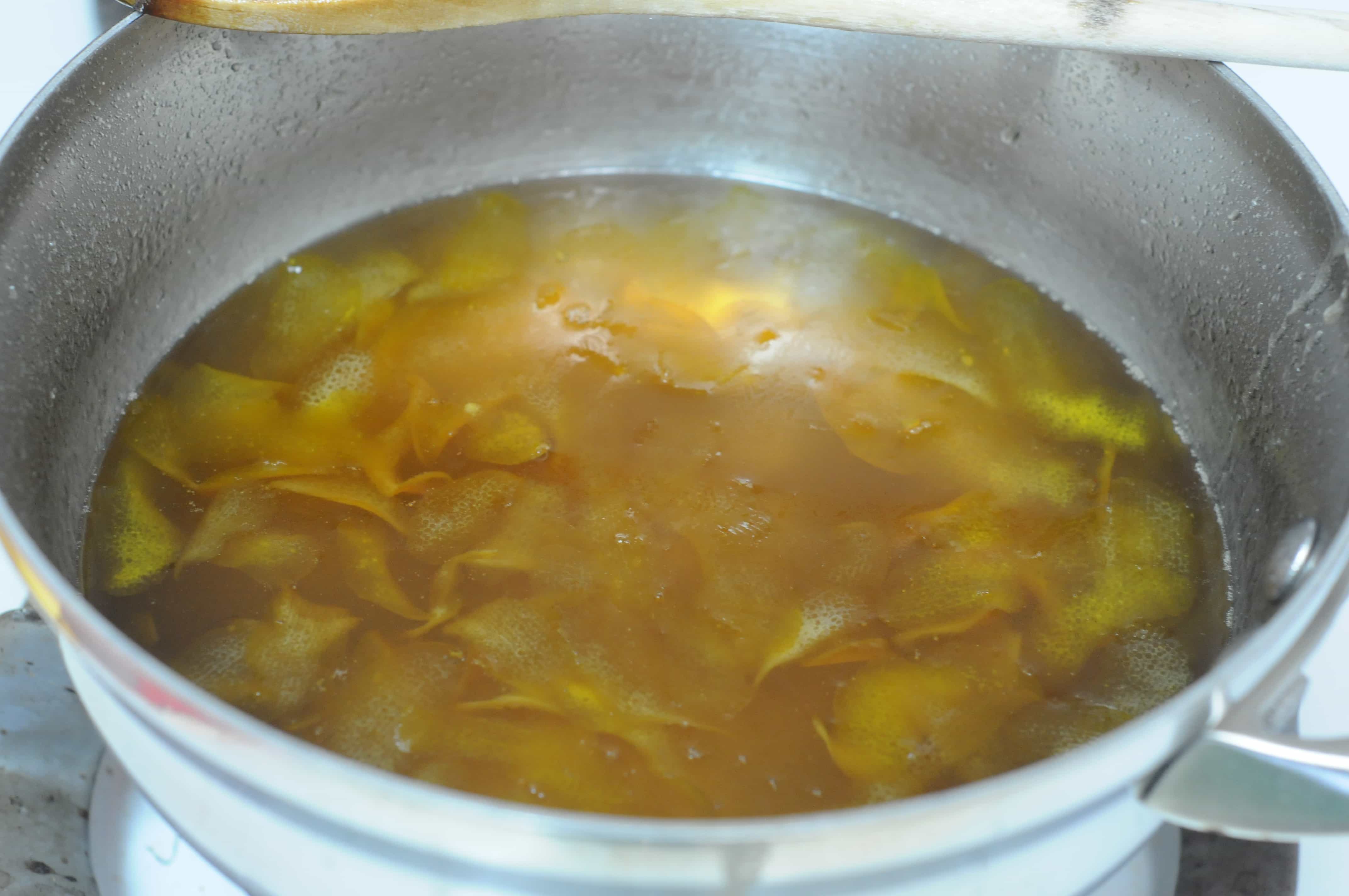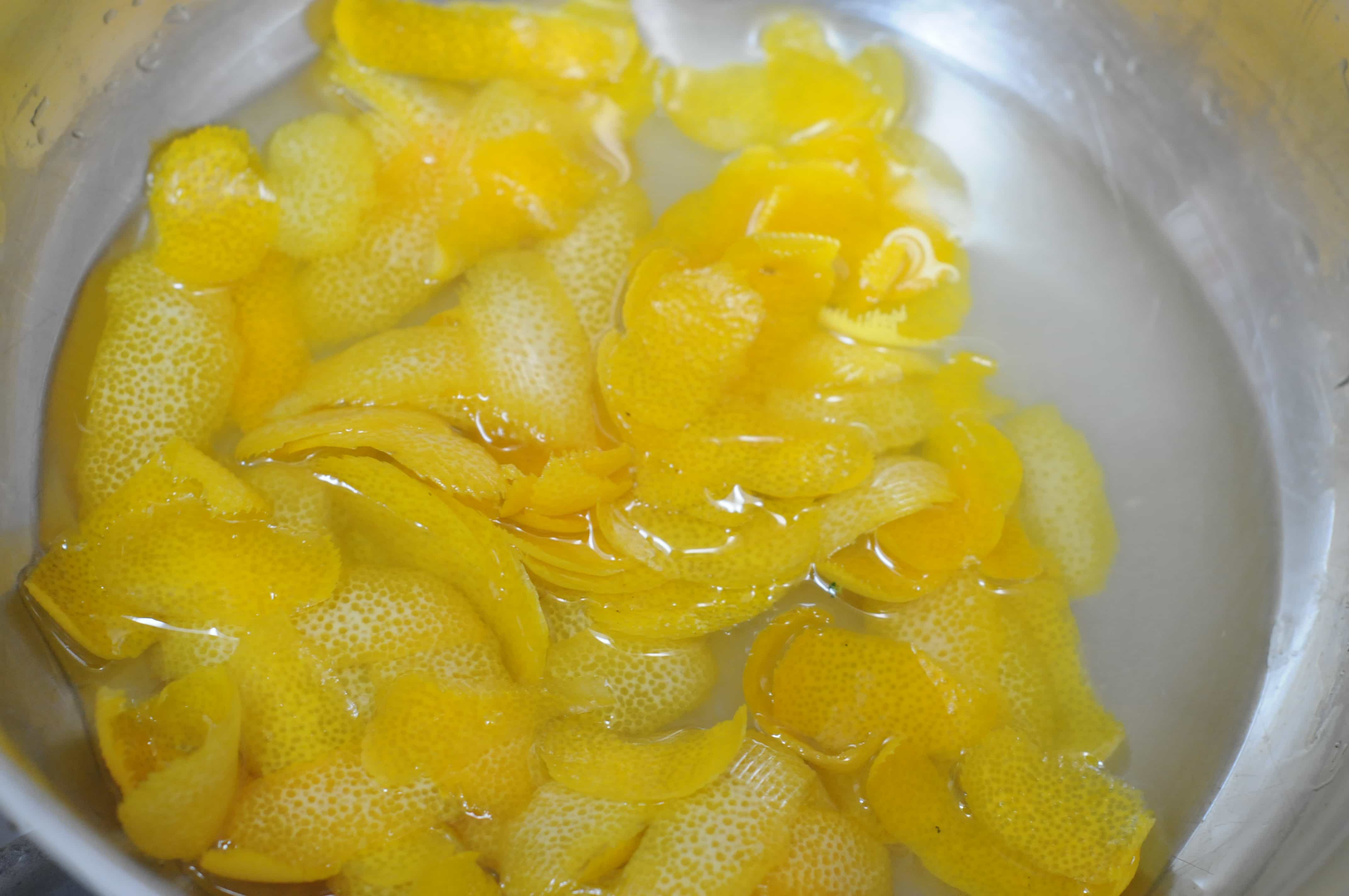 Peel the lemons with vegetable peeler, taking off long, thin strips (my all time favorite vegetable peeler is this one from Messermeister). Fill a medium sauce pan 3/4 full with water and 1/2 teaspoon salt. Add the lemon peels and bring to a boil. Simmer for 10 minutes, then drain.