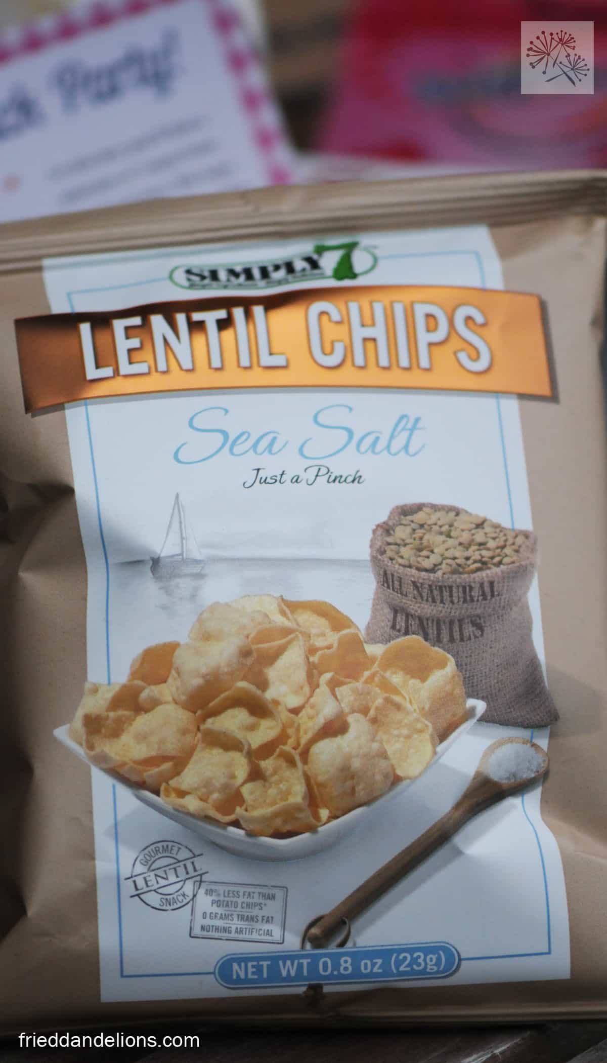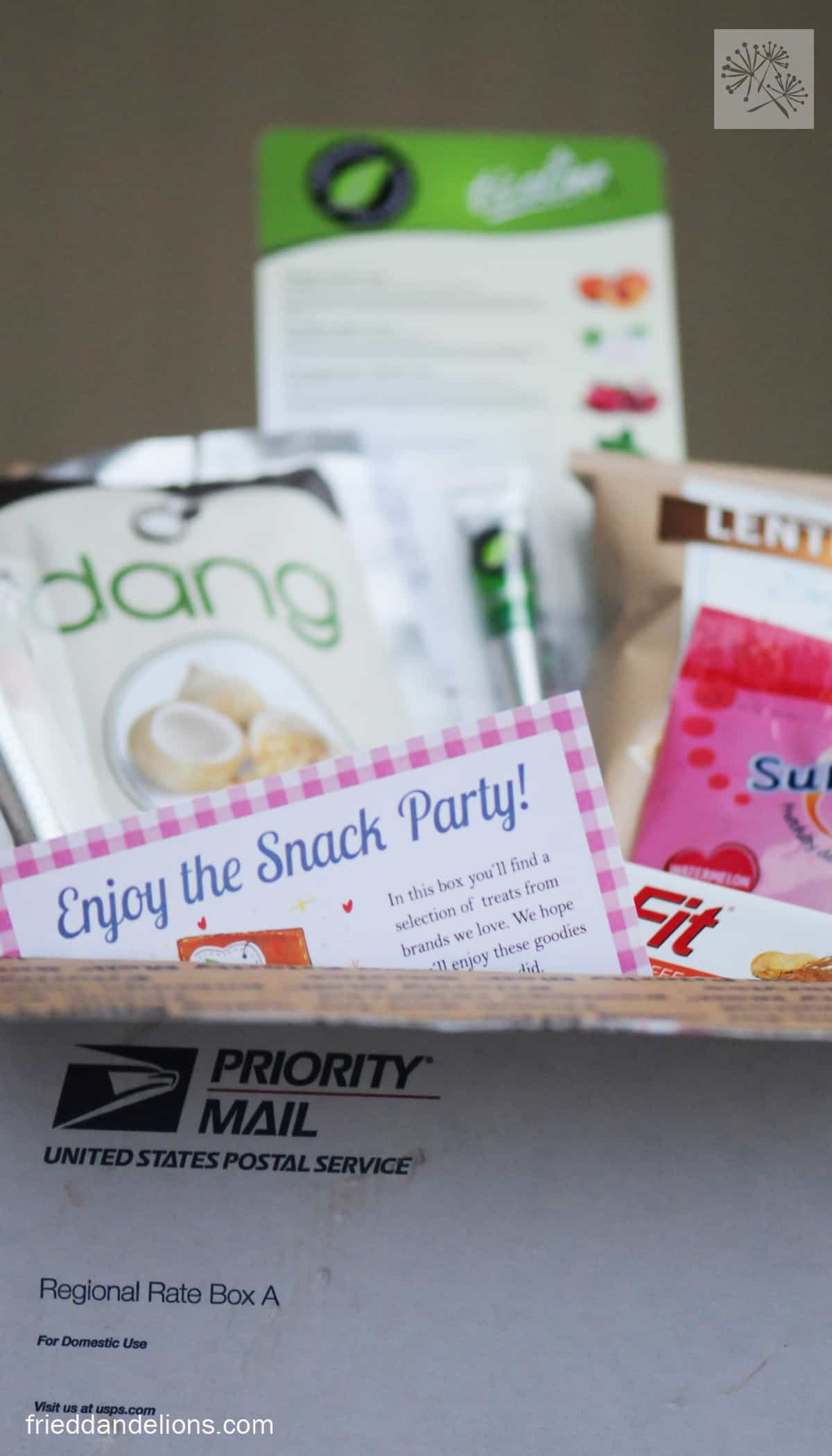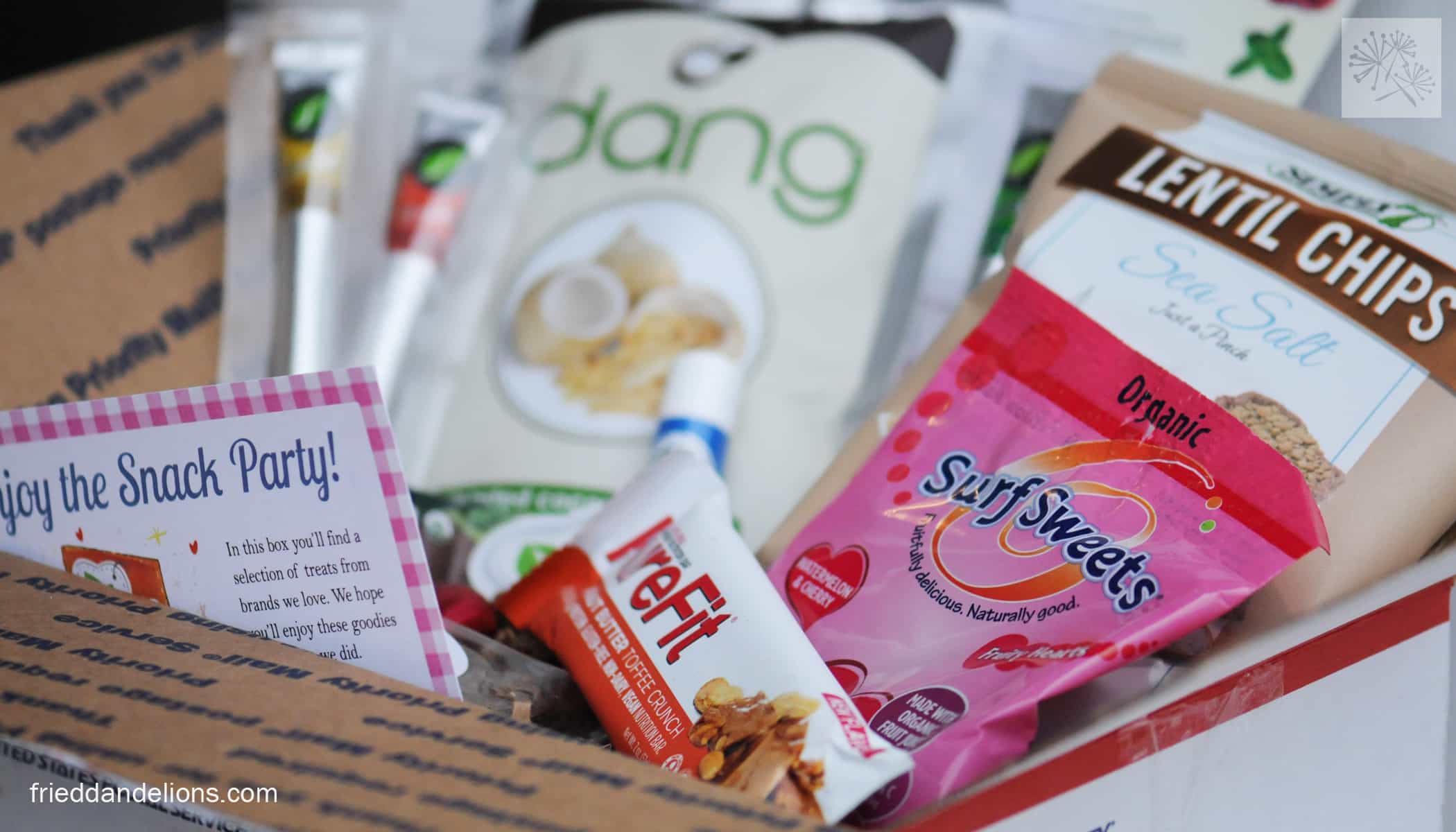 My box was a very simple USPS box—no fancy logos or labels, no extra packaging. Just a plain box full of good treats and some brown paper crinkle shred. I was impressed at the amount of items in the box. I received 1 bag of lentil chips, 1 bag of coconut chips, 3 tea “sticks,” 1 chocolate heart, 1 mint chocolate candy, 1 energy bar, 1 snack bar, 1 chapstick, and 1 bag of gummy heart candies. I quickly snapped a few pictures of the box, and then waited for David to get up from his nap to see the box before digging in. He and I picked the lentil chips for our first snack.