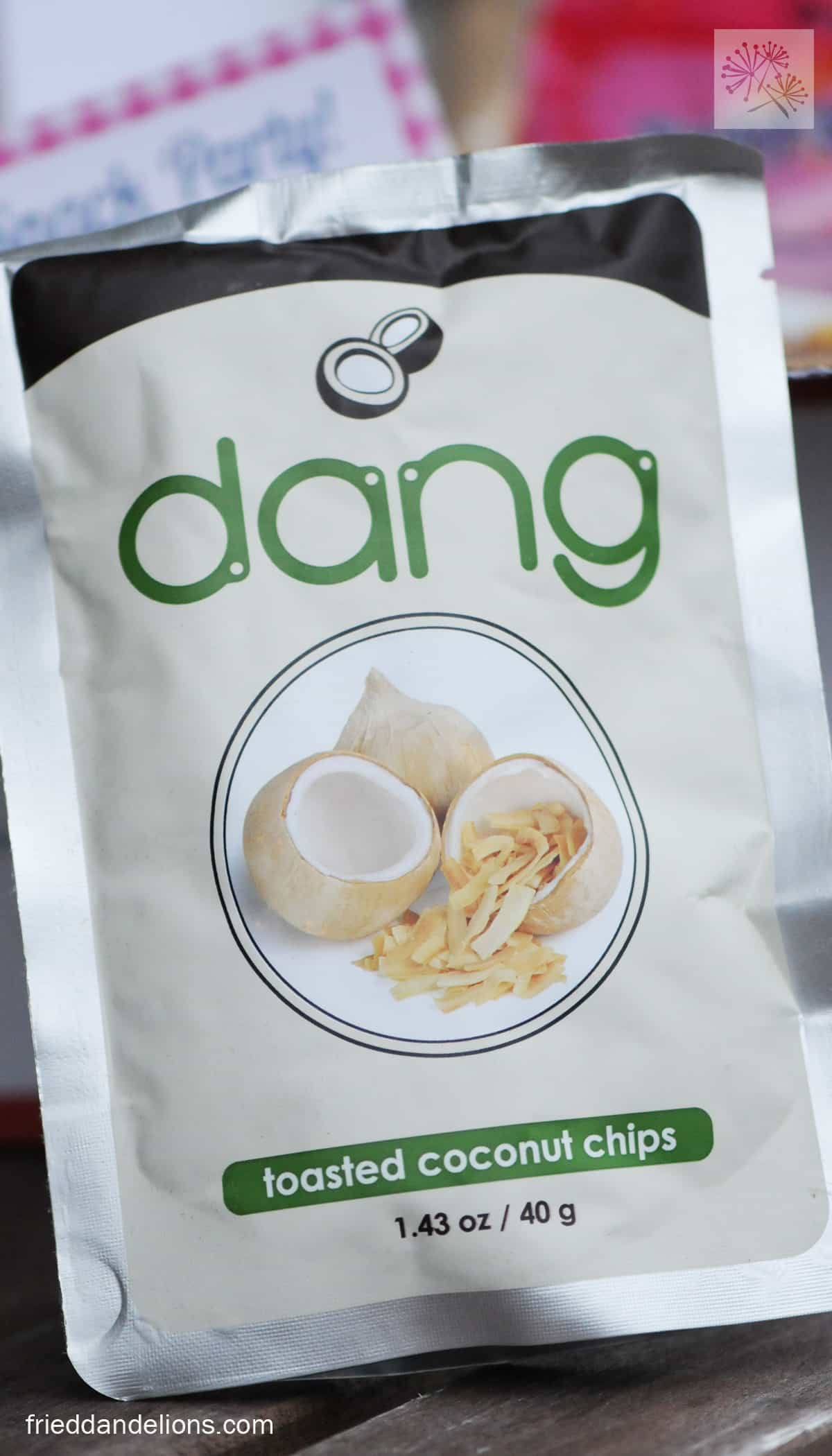 My other favorite item was the Dang! Coconut Chips. They are delicious, and only 3 ingredients—coconut, salt and sugar. They are sweet and salty, almost like kettle corn—do you have that where you are or is it just a northwest thing? Anyway, I digress. The coconut chips were great on their own. I also found out that they made a great topping. I stirred them in to rice, and used them on top of coconut chia pudding. I was glad to see them on sale at my local natural food coop PCC this week and snagged another bag. And the name—the name of the founder’s mother who is from Thailand—Dang! That’s Good.