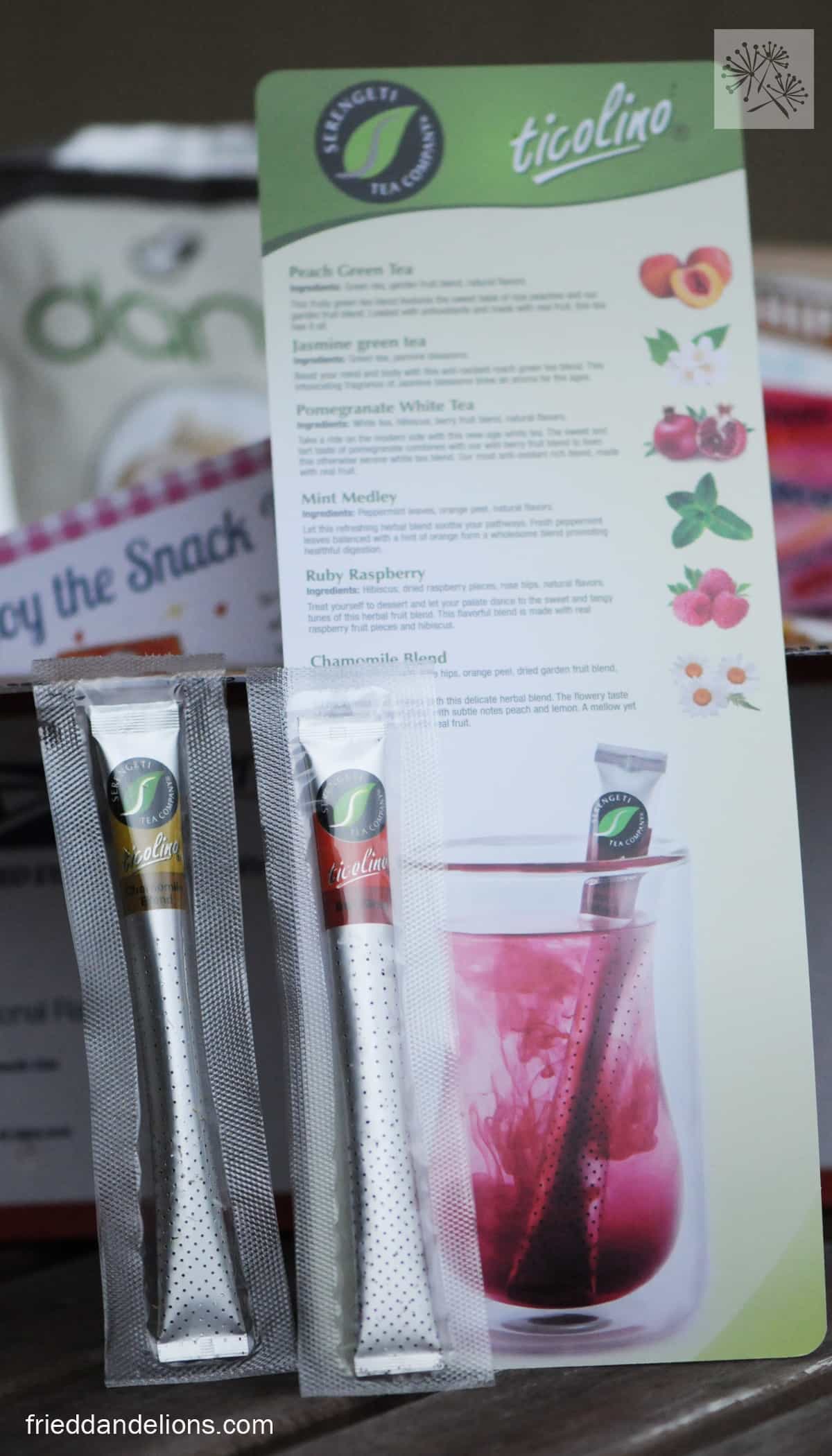 I really liked the Serengeti tea sticks. They are a small tube filled with loose tea, and punctured with tiny holes up and down—a disposable infuser. All you do is add one to a mug of hot water and swirl it around. I have a reusable tea infuser that I use often. I thought the Serengeti tea sticks would be really good for people who travel, or people that might want to enjoy a cup of tea at work in the afternoon. I’ve enjoyed the Jasmine Pearl and the Earl Grey flavors so far, and still have Chamomile left to try.