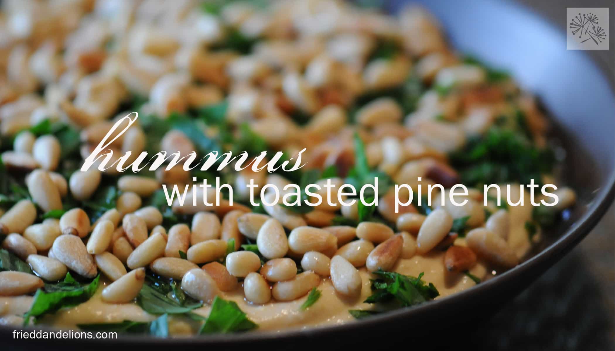 I made hummus for dinner tonight, and tried a garnish idea I’d been seeing—hummus loaded with parsley and toasted pine nuts. It was delicious—creamy pine nuts in every bite! And it looks so pretty too! Try it next time you make hummus!