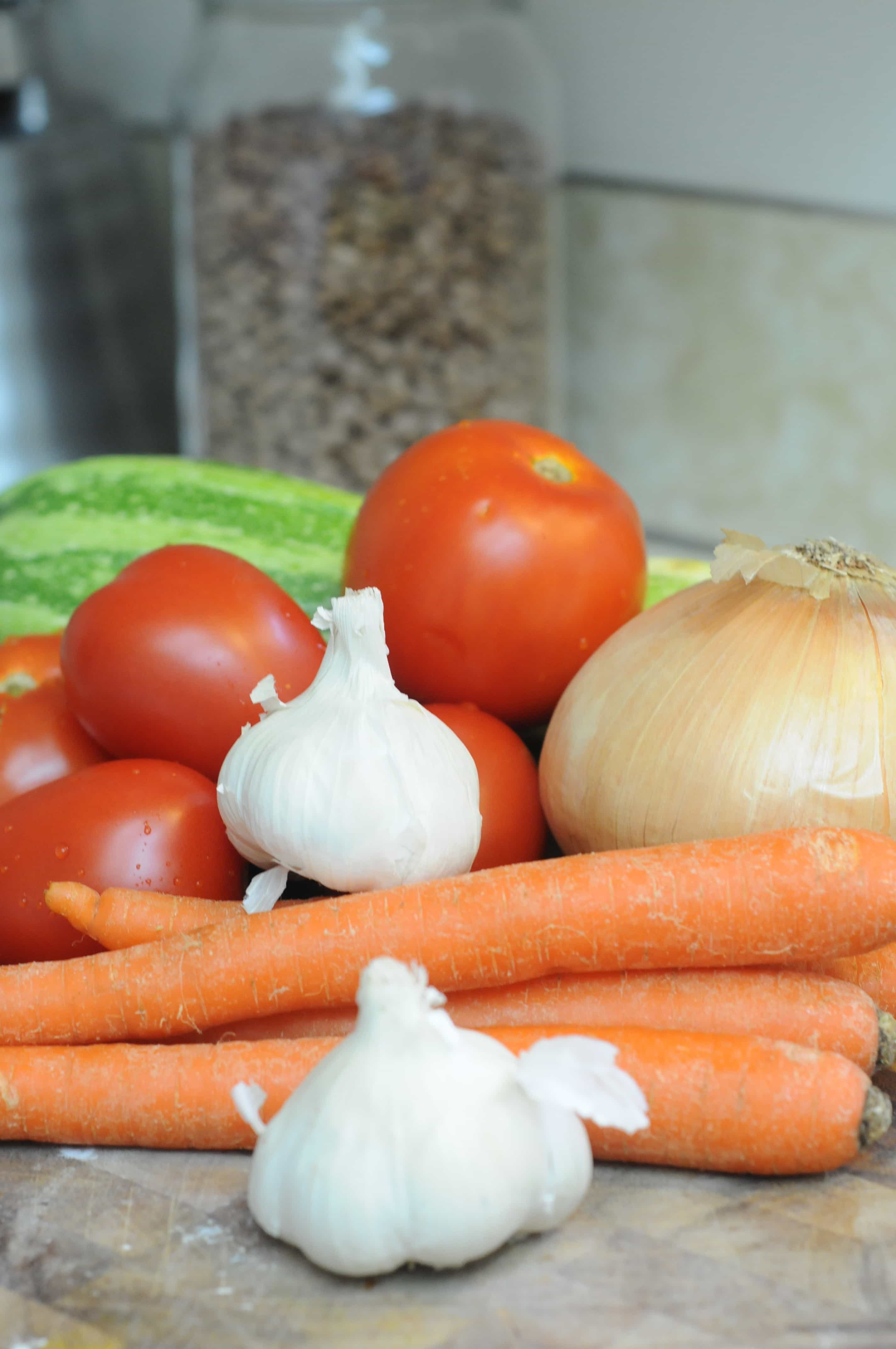 Prep veggies for roasting. Core tomatoes, but you can leave them whole for roasting. Cut top and bottom off onion, and then quarter (make sure the top that holds the onion together is gone). Peel and cut carrots into one inch pieces—don’t leave them too large, as they take much longer to soften than the other veggies. Cut the top and bottom off of zucchini and then cut into a few smaller chunks.