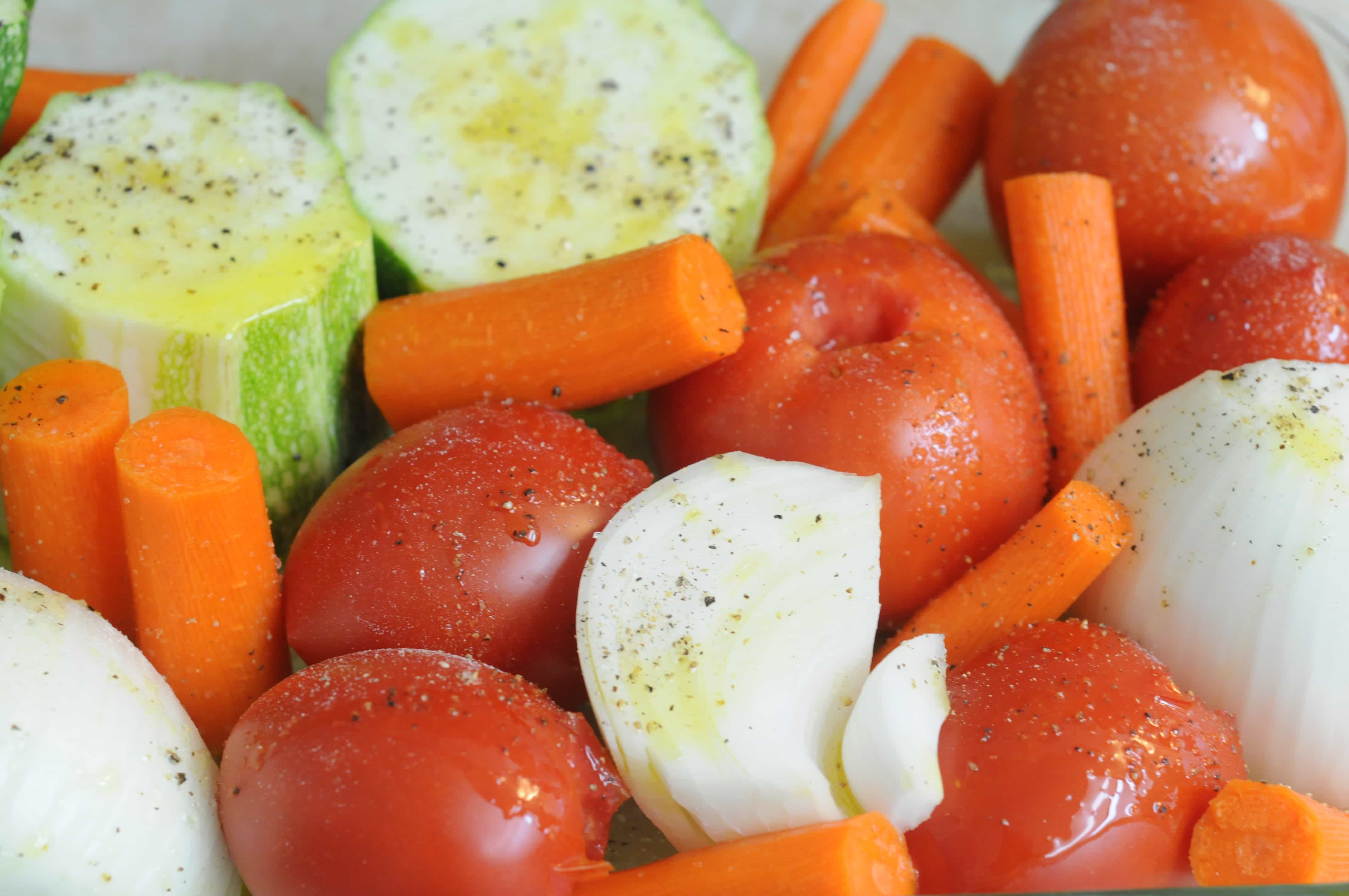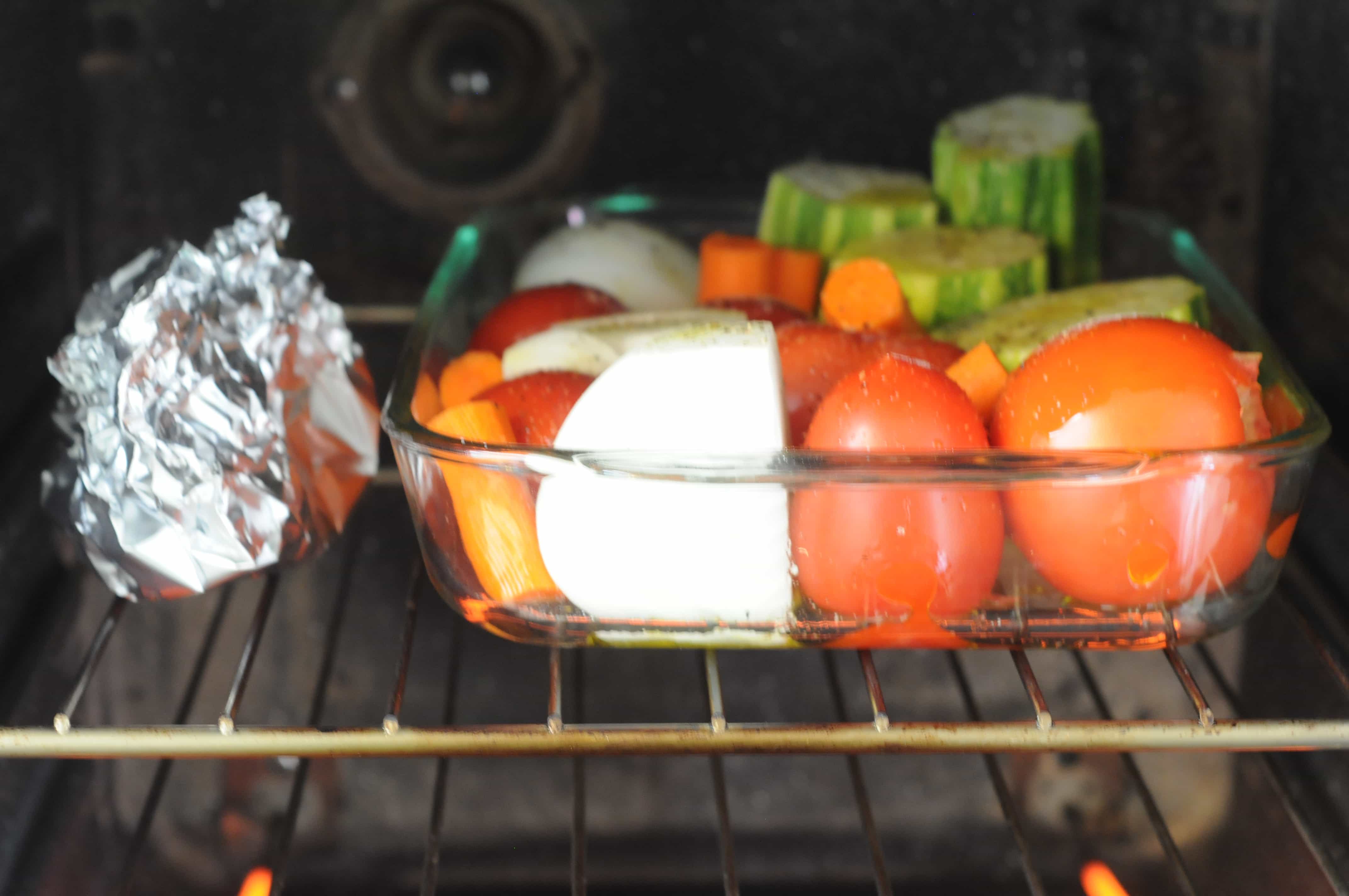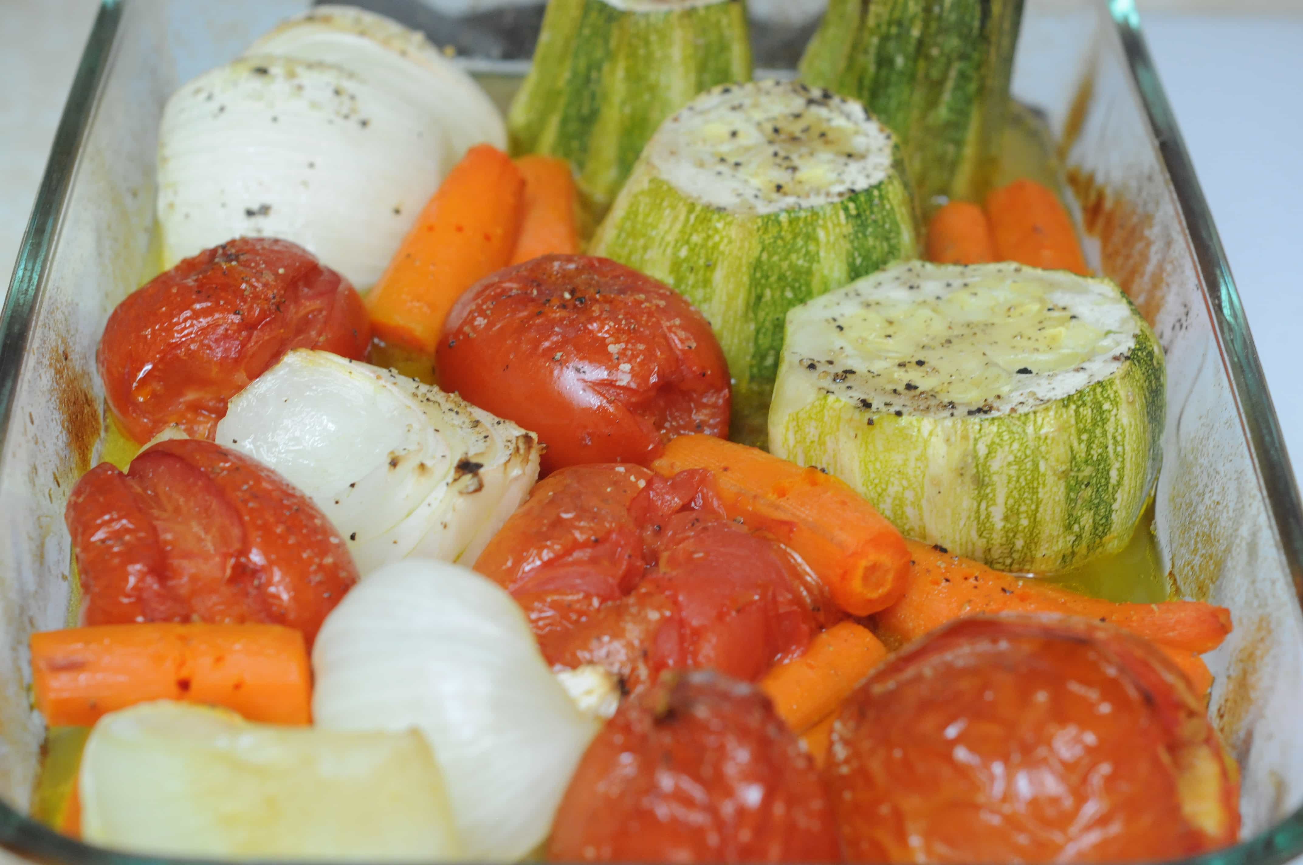 Place all veggies in a large glass baking dish and drizzle 3 T of olive oil over top. Sprinkle salt, pepper, and oregano evenly over all vegetables (about 2 tsp salt, 1 tsp pepper, 1 tsp oregano). Place in oven and cook for about an hour, or until all vegetables are easily pierced with a fork.