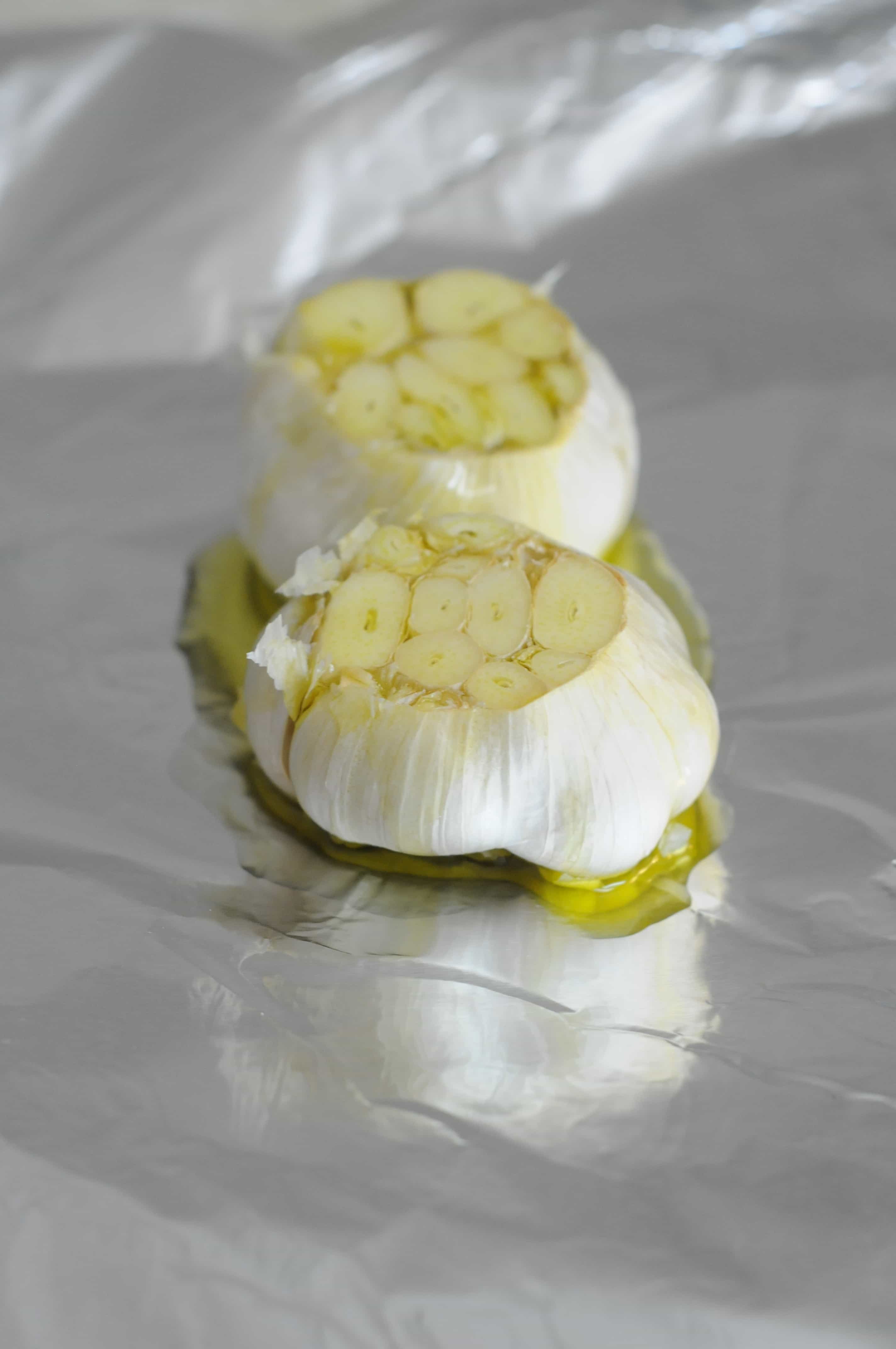 Cut tops off of both heads of garlic, exposing all of the cloves. Place in center of piece of foil. Drizzle liberally with olive oil. Fold foil up around the garlic, leaving the top a bit open. Place in oven directly on rack and roast along with the other vegetables.