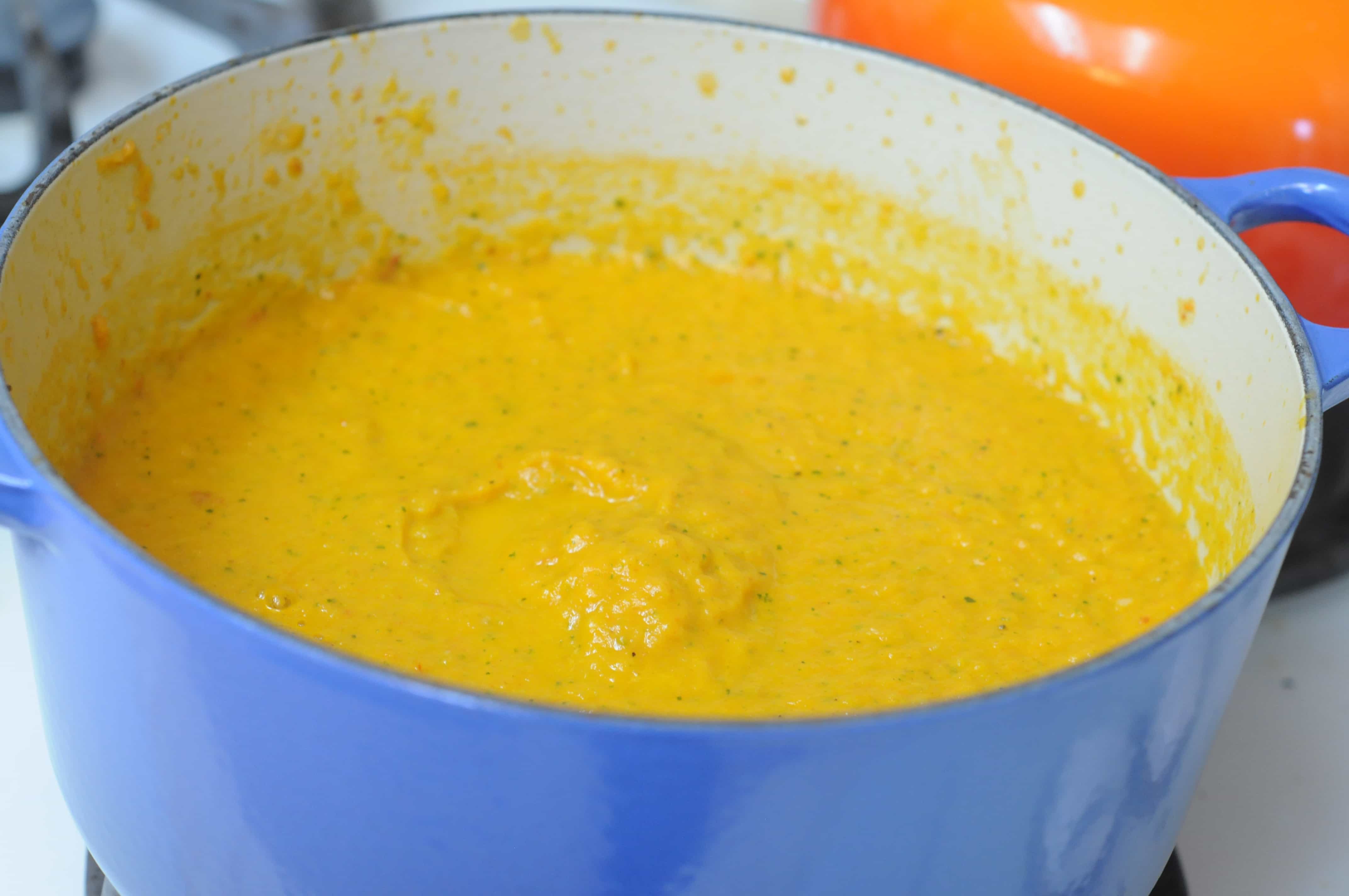 Bright orange with green flecks of basil—the color will vary depending on your vegetable combination!
