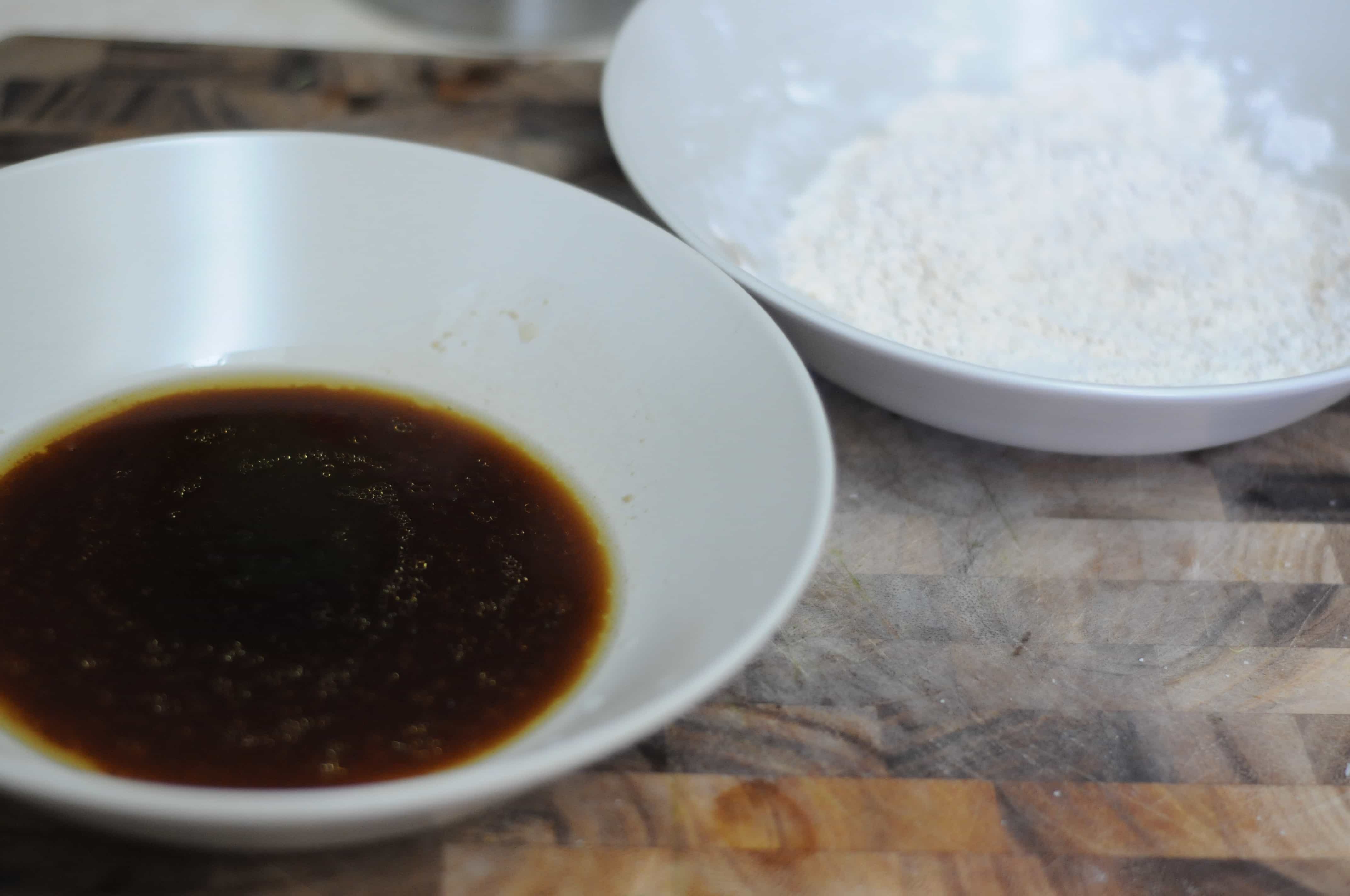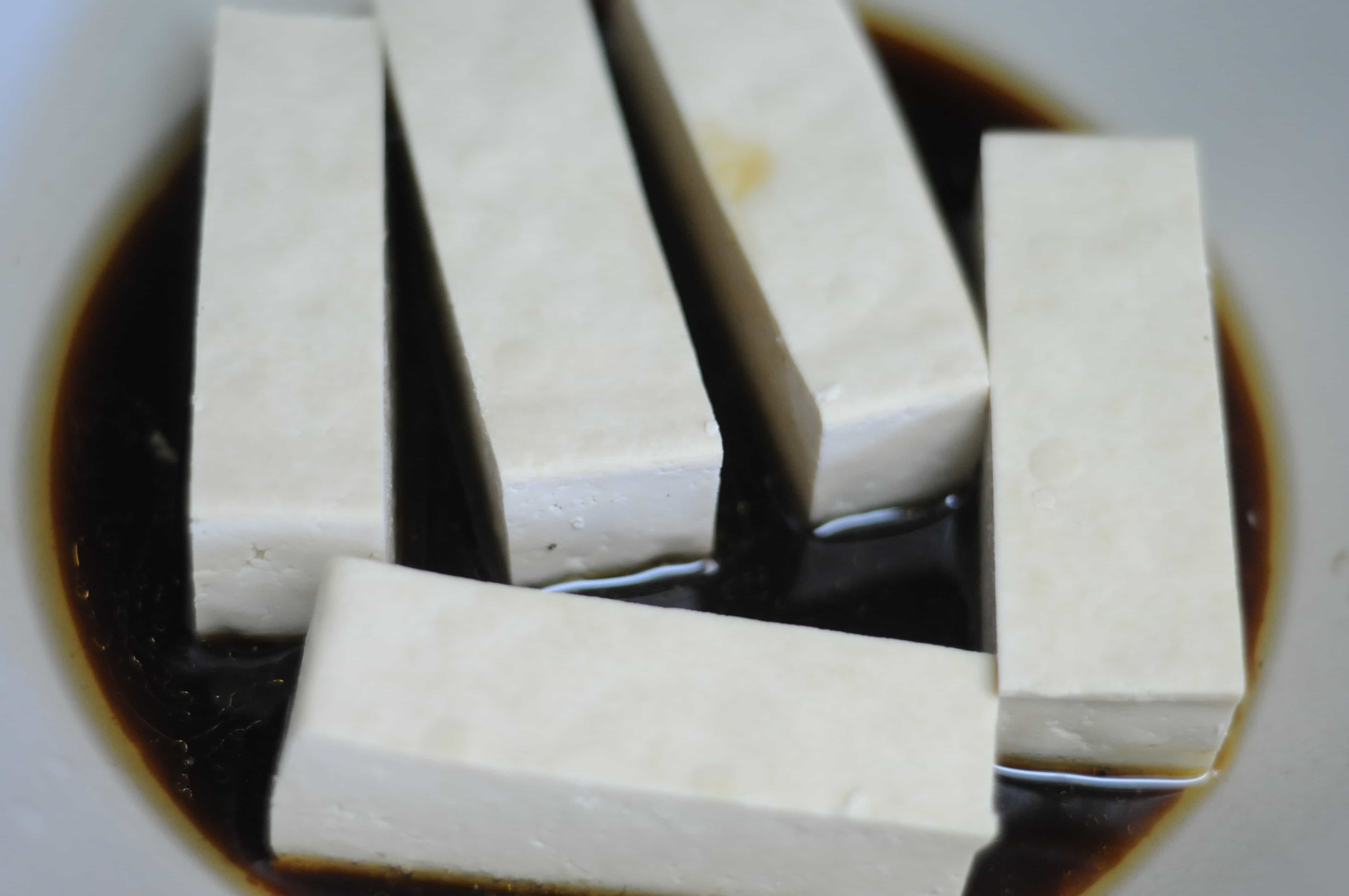 Place 4-6 pieces of tofu into the soy sauce mixture. Let sit for 2 minutes, then flip. Let sit 2 minutes more.