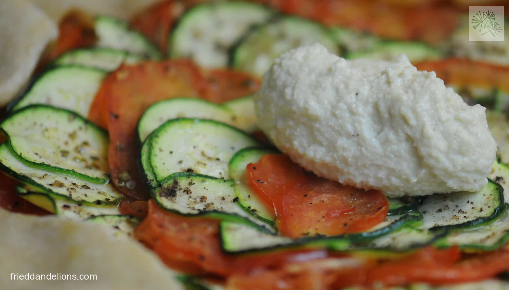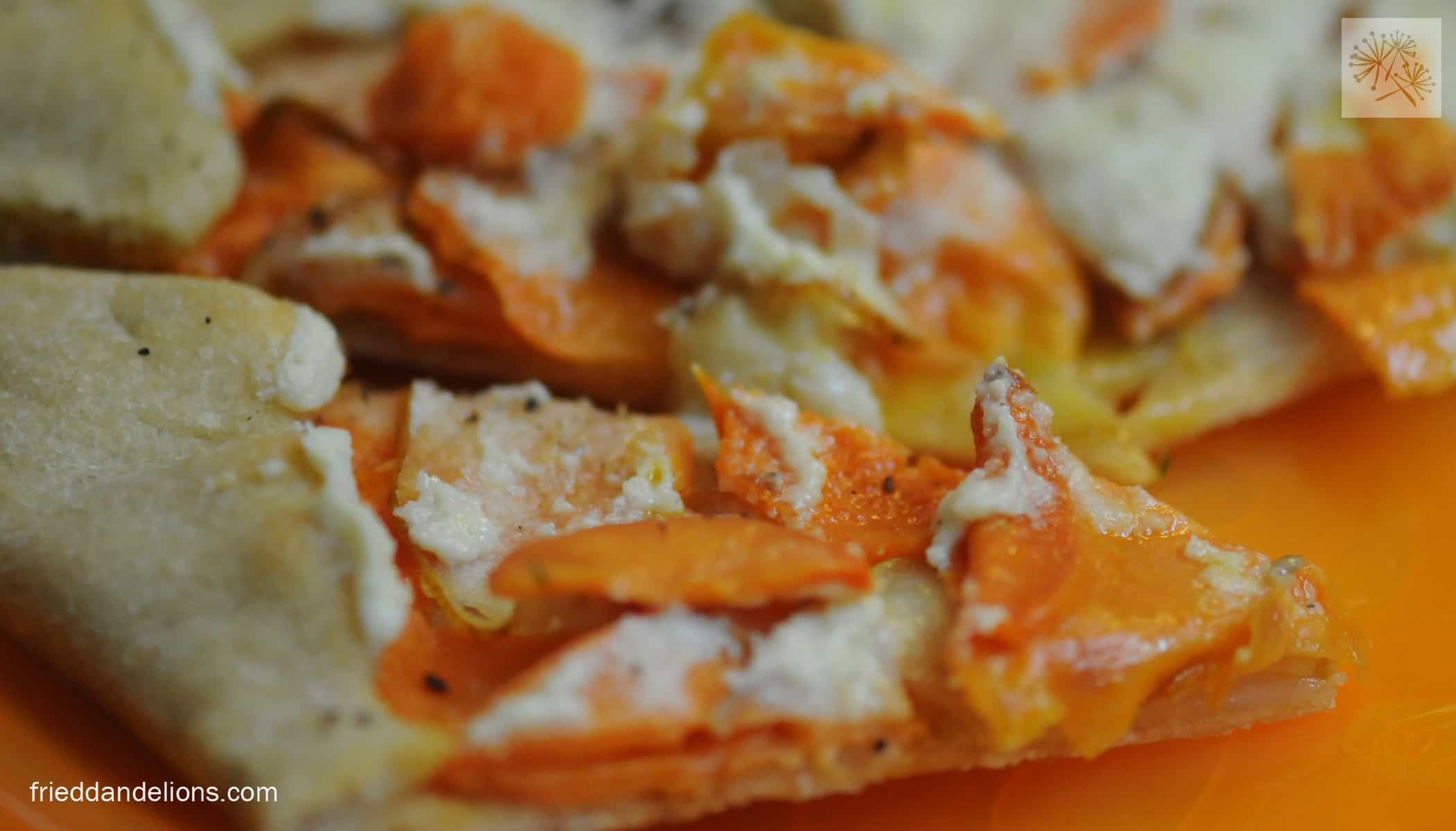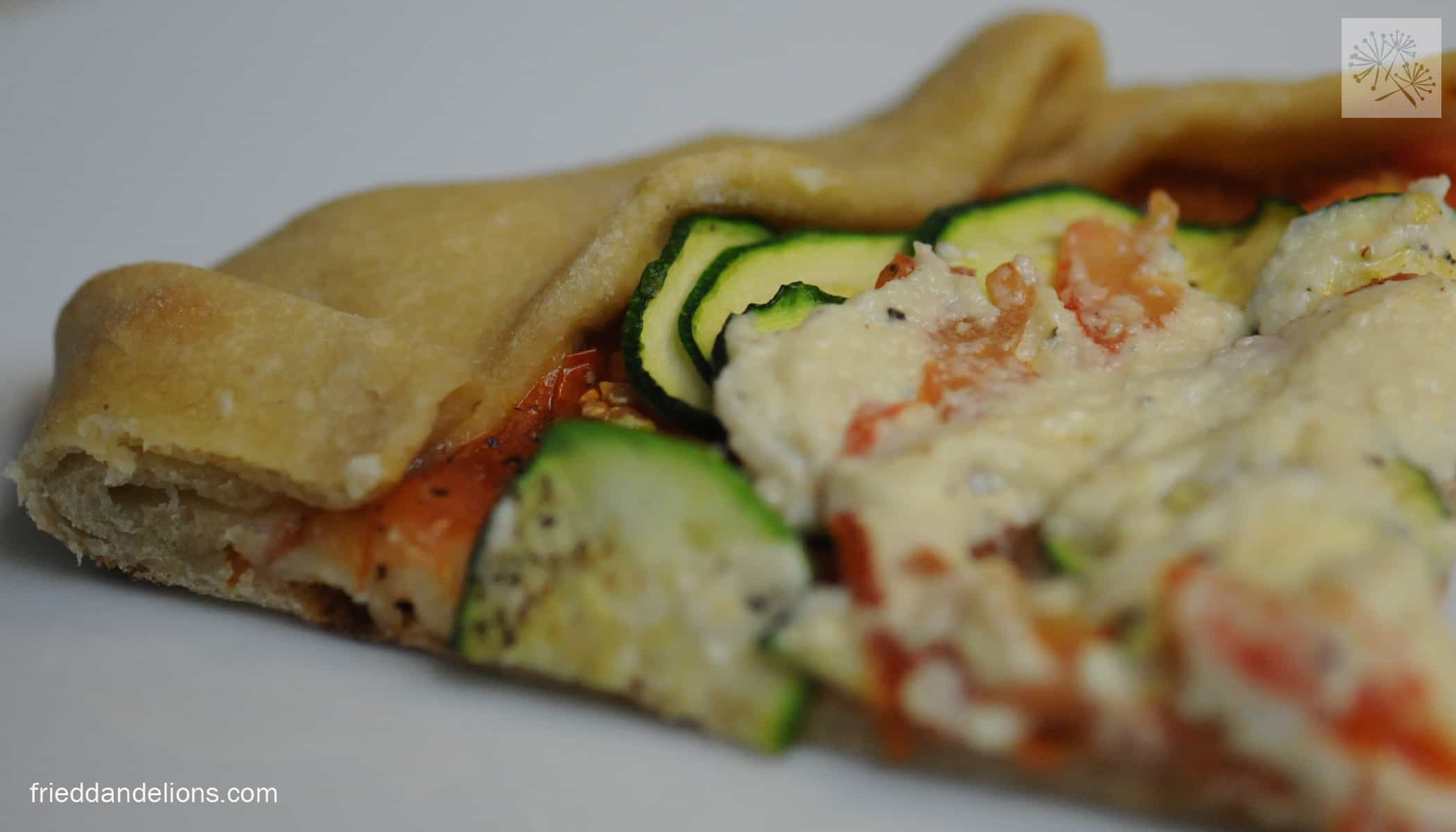 Once your dough is rolled out, drizzle with a tiny bit of olive oil. Now you can choose whether you want to put your pine nut spread on the crust, or on top of the toppings. I did mine on top last weekend and will try under next time. Then layer your toppings on, and out to about a half-inch away from the edge. Fold your edges over, pleating as you go to make the crust. Drizzle the crust with a bit more olive oil and then place your pan in the oven. It takes about 10 minutes to cook, maybe less. Watch your pizza and make sure the bottom crust isn’t getting too brown. When fully cooked, remove from oven and add a dollop of pine nut spread. Let cool a minute to set and then slice. Time to dig in!