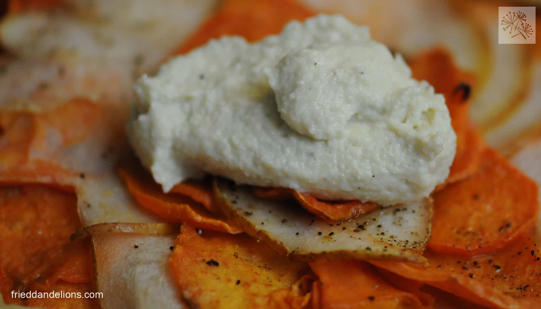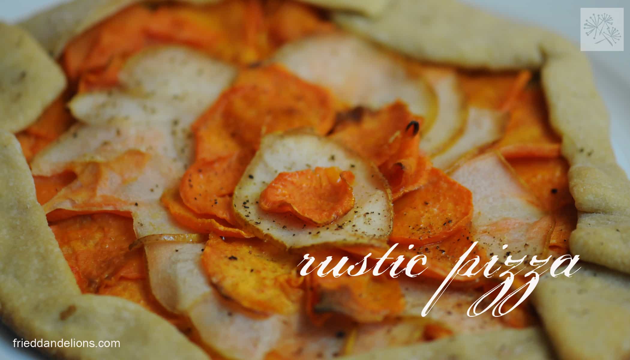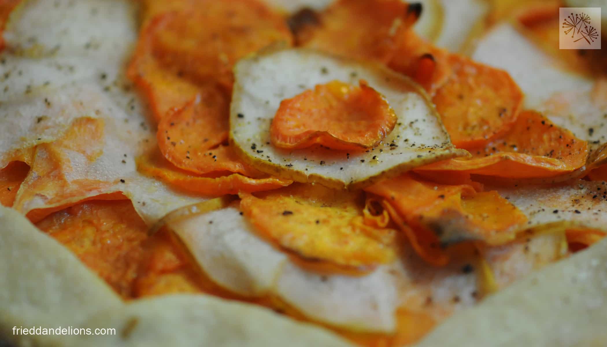 Once your dough is rolled out, drizzle with a tiny bit of olive oil. Now you can choose whether you want to put your pine nut spread on the crust, or on top of the toppings. I did mine on top last weekend and will try under next time. Then layer your toppings on, and out to about a half-inch away from the edge. Fold your edges over, pleating as you go to make the crust. Drizzle the crust with a bit more olive oil and then place your pan in the oven. It takes about 10 minutes to cook, maybe less. Watch your pizza and make sure the bottom crust isn’t getting too brown. When fully cooked, remove from oven and add a dollop of pine nut spread. Let cool a minute to set and then slice. Time to dig in!