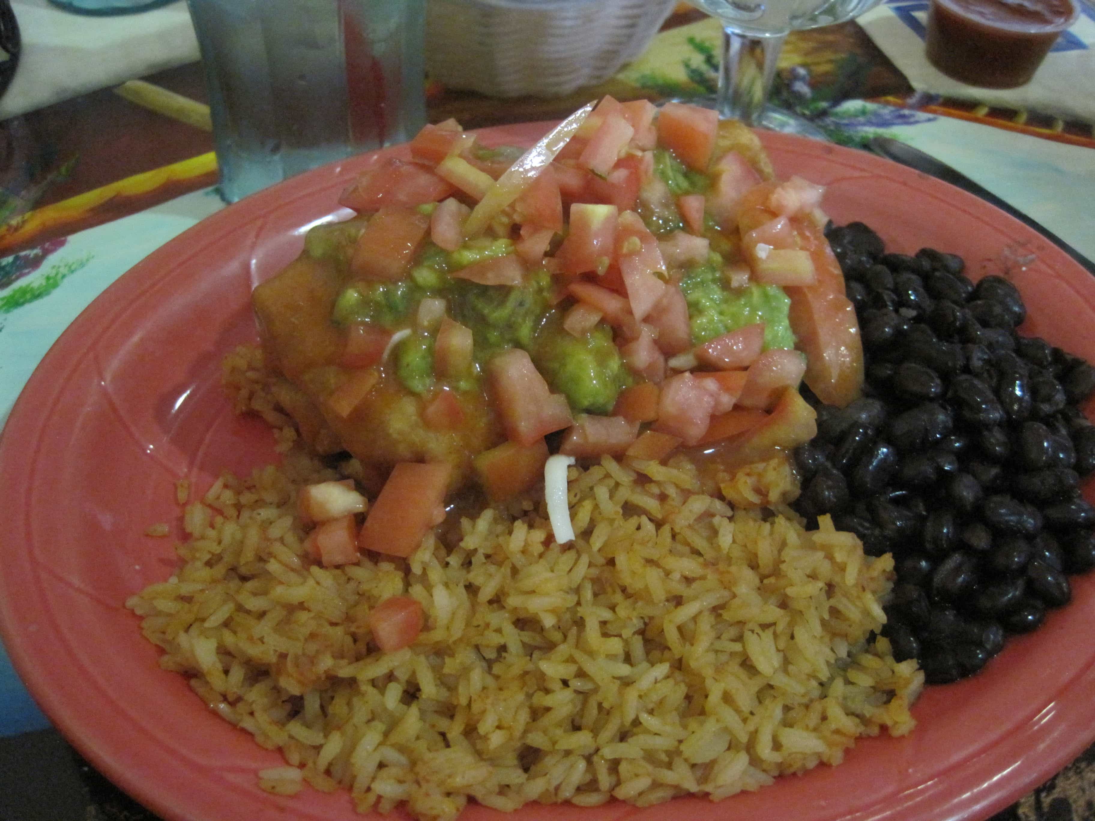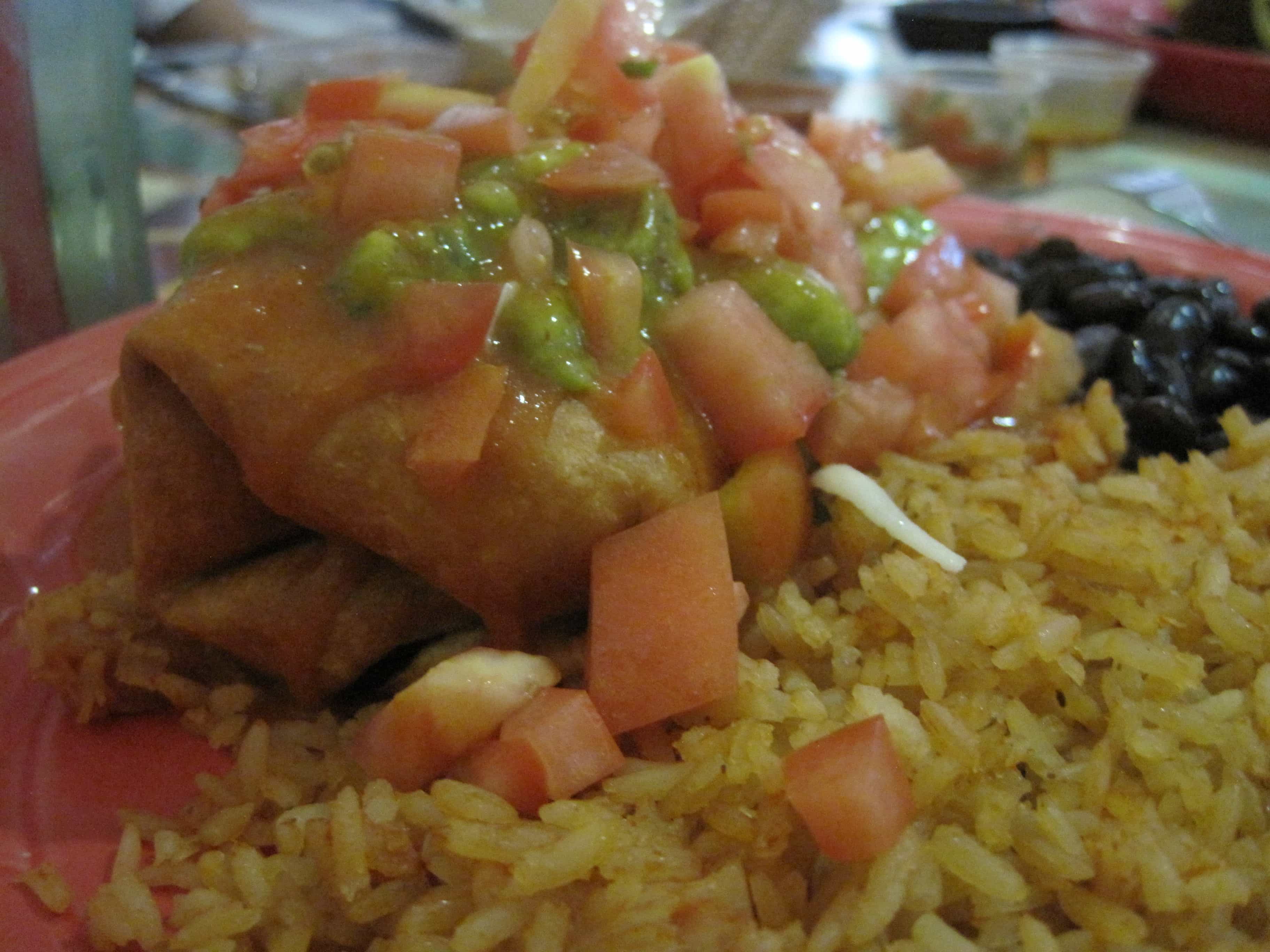 For my entrée I had the Vegetable Chimichanga…essentially a fried burrito! It was delicious (how could it not be?). It was stuffed with veggies and topped with more awesome guacamole. It was served with a side of rice and whole black beans (tip: most Mexican restaurants serve whole beans if you ask, a healthy alternative to refried beans!).