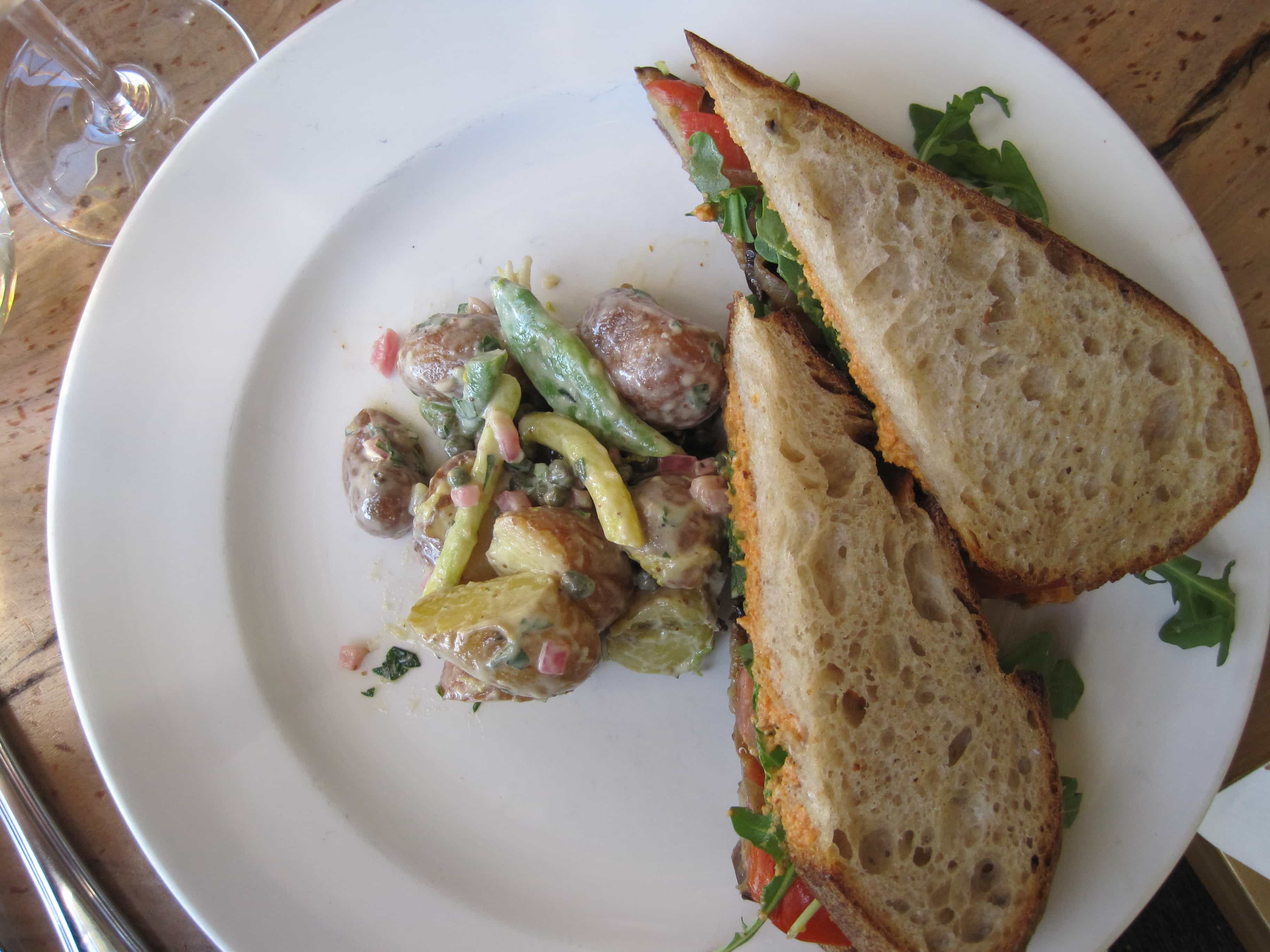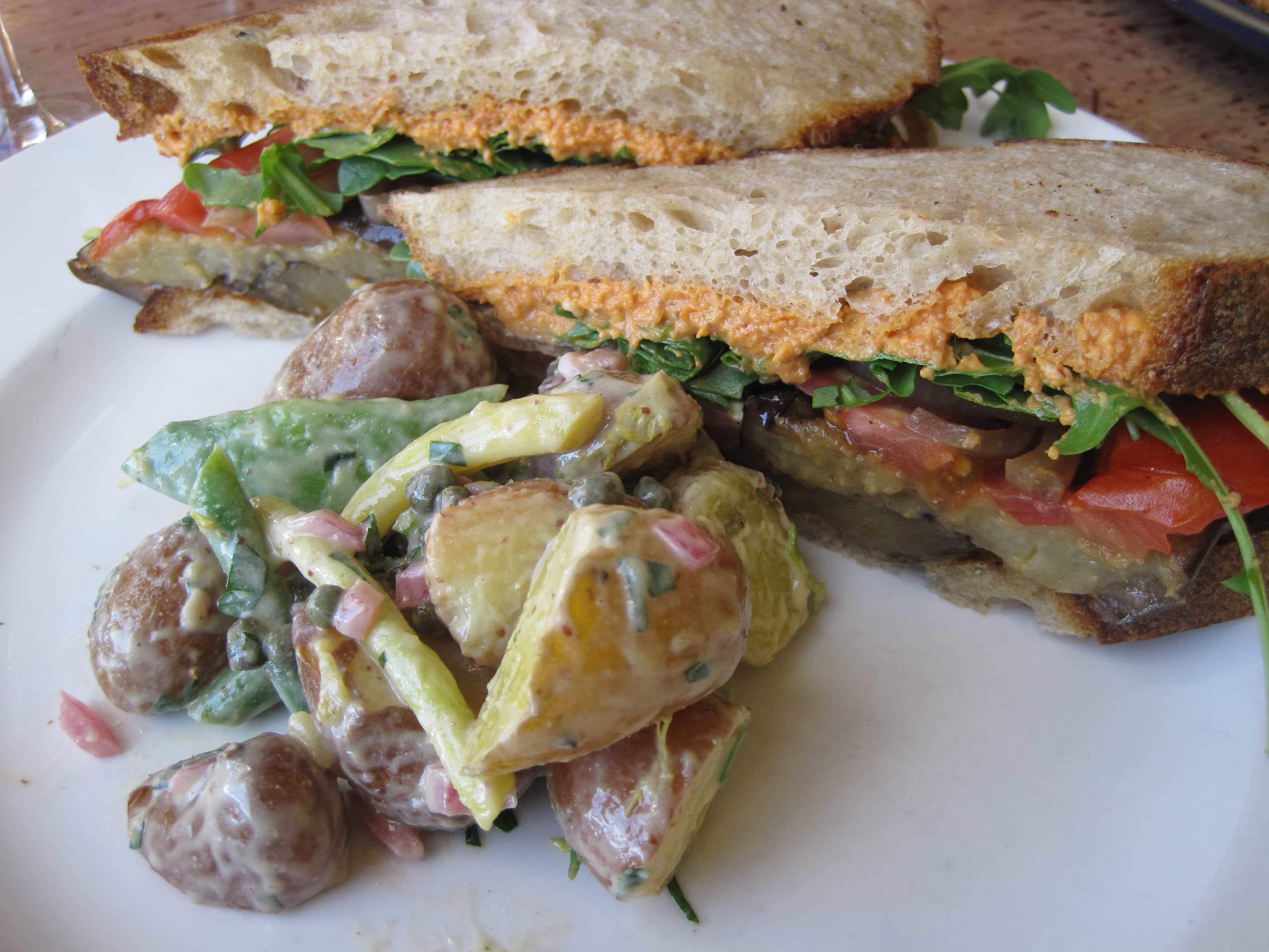 For my main course I had the roasted eggplant sandwich. I’m not a huge fan of eggplant, but the rest of the sandwich ingredients looked so good, and if someone is going to make a good eggplant sandwich it is going to be a vegetarian restaurant! So glad I went for it…it was awesome! The bread was spread with romesco, a red pepper dip. Then it was stuffed with caramelized onions, tomatoes, greens, and roasted eggplant. It came with a side of potato salad, but not just any ordinary potato salad! Yukon gold potatoes, green and yellow wax beans, capers and shallot were tossed in a champagne vinegar Dijon sauce…yum!