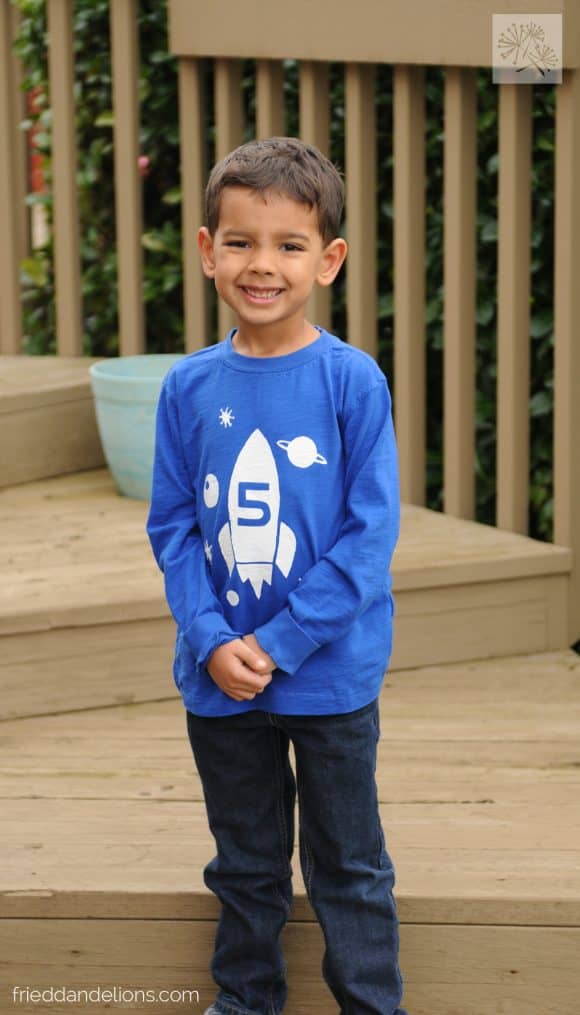 ^^^ I painted his shirt myself, using a design I created in Illustrator and this tutorial. I really enjoy making these fun freezer paper shirts!