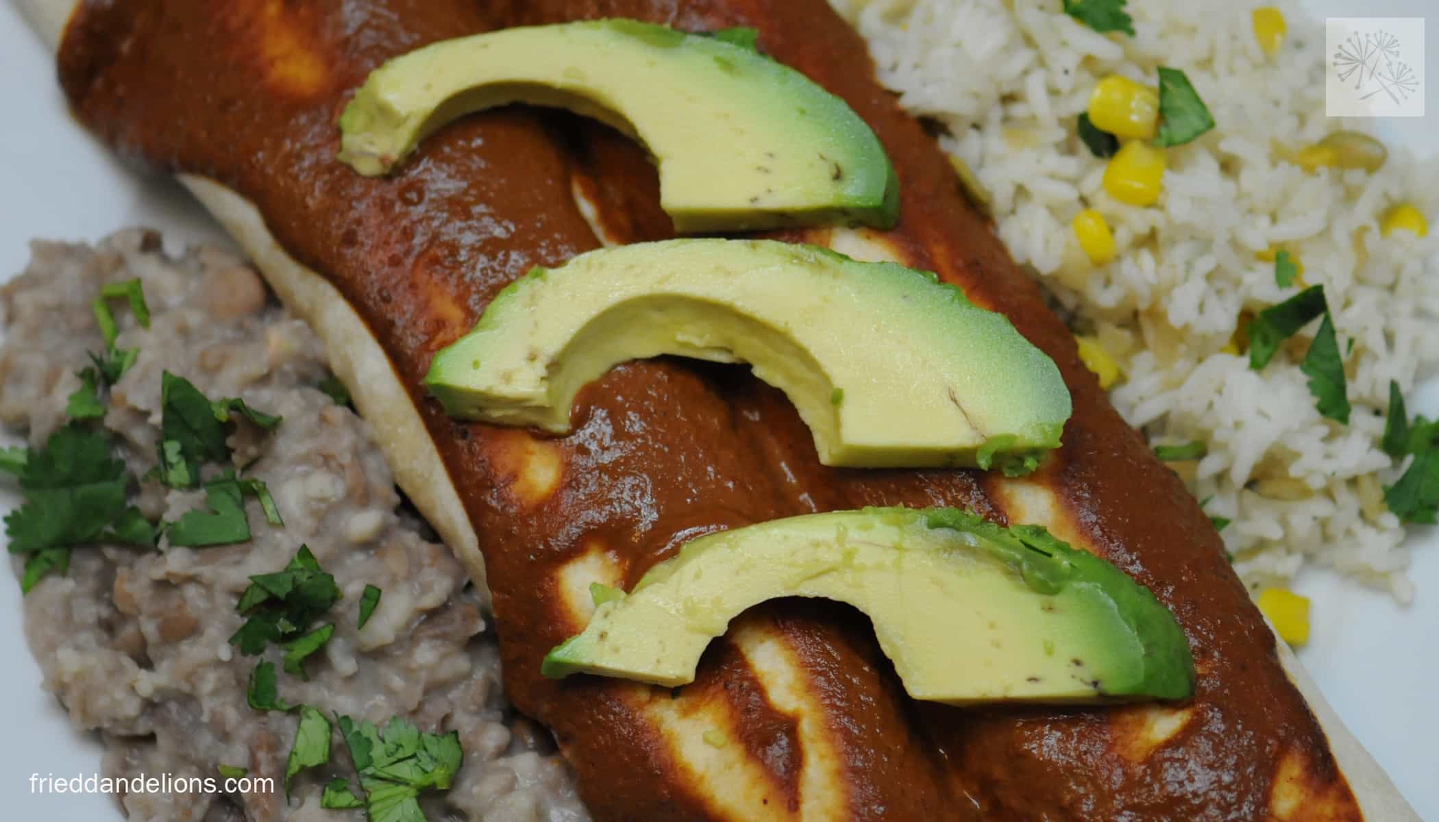 Place ½ cup mole sauce in bottom of glass, oven proof dish. Place ½ c of roasted vegetable filling on edge of tortilla and roll up, keeping filling inside. Place in dish, seam side down. Continue with the rest of the filling and tortillas. I used two dishes to make 10 enchiladas. Once all enchiladas are rolled, smother with more sauce, about ½ – 1 cup per 4 enchiladas. Bake at 350 for 10 minutes. Serve with avocado garnish, beans and rice. Enjoy with your favorite sweethearts!