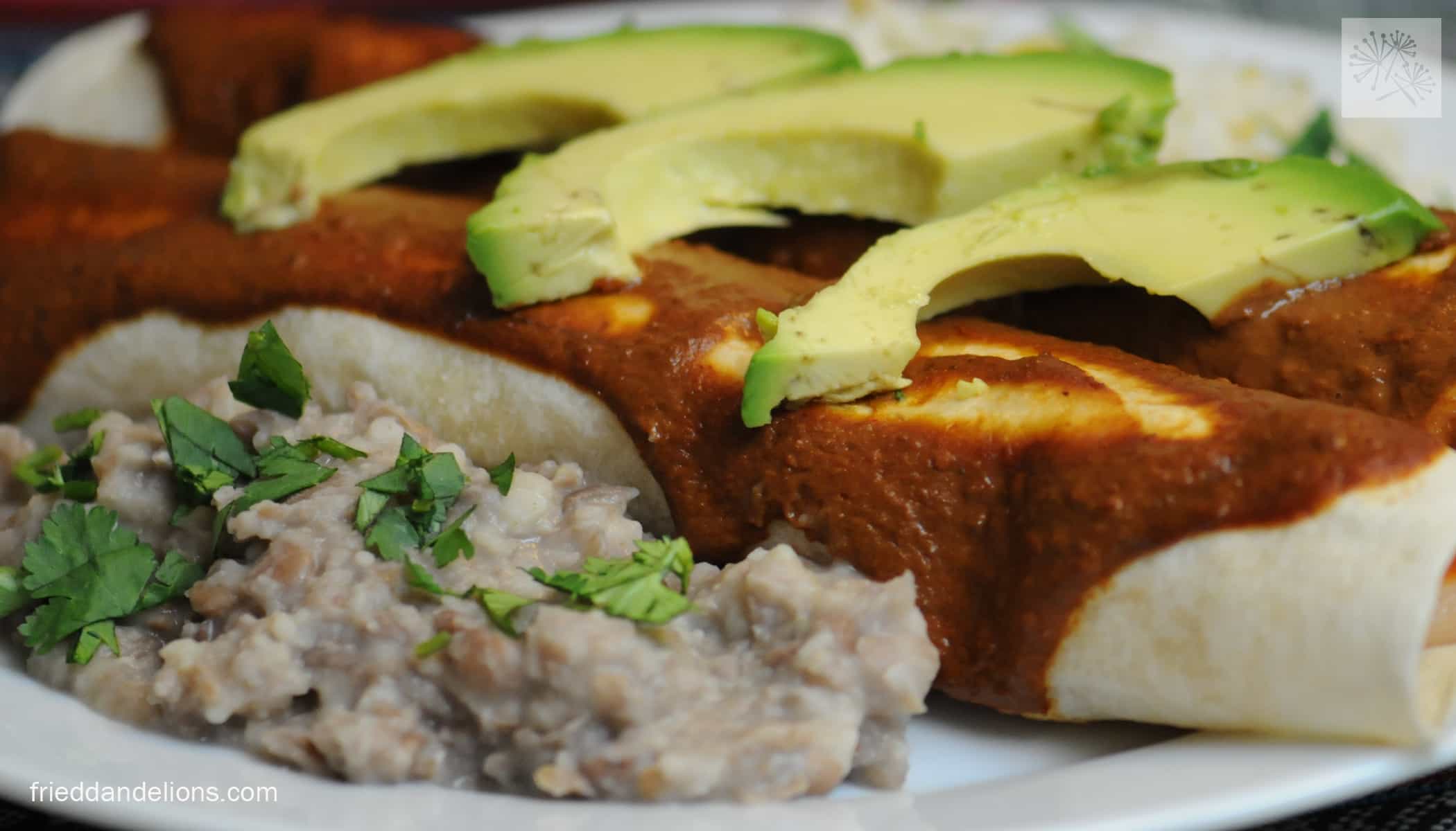 Place ½ cup mole sauce in bottom of glass, oven proof dish. Place ½ c of roasted vegetable filling on edge of tortilla and roll up, keeping filling inside. Place in dish, seam side down. Continue with the rest of the filling and tortillas. I used two dishes to make 10 enchiladas. Once all enchiladas are rolled, smother with more sauce, about ½ – 1 cup per 4 enchiladas. Bake at 350 for 10 minutes. Serve with avocado garnish, beans and rice. Enjoy with your favorite sweethearts!