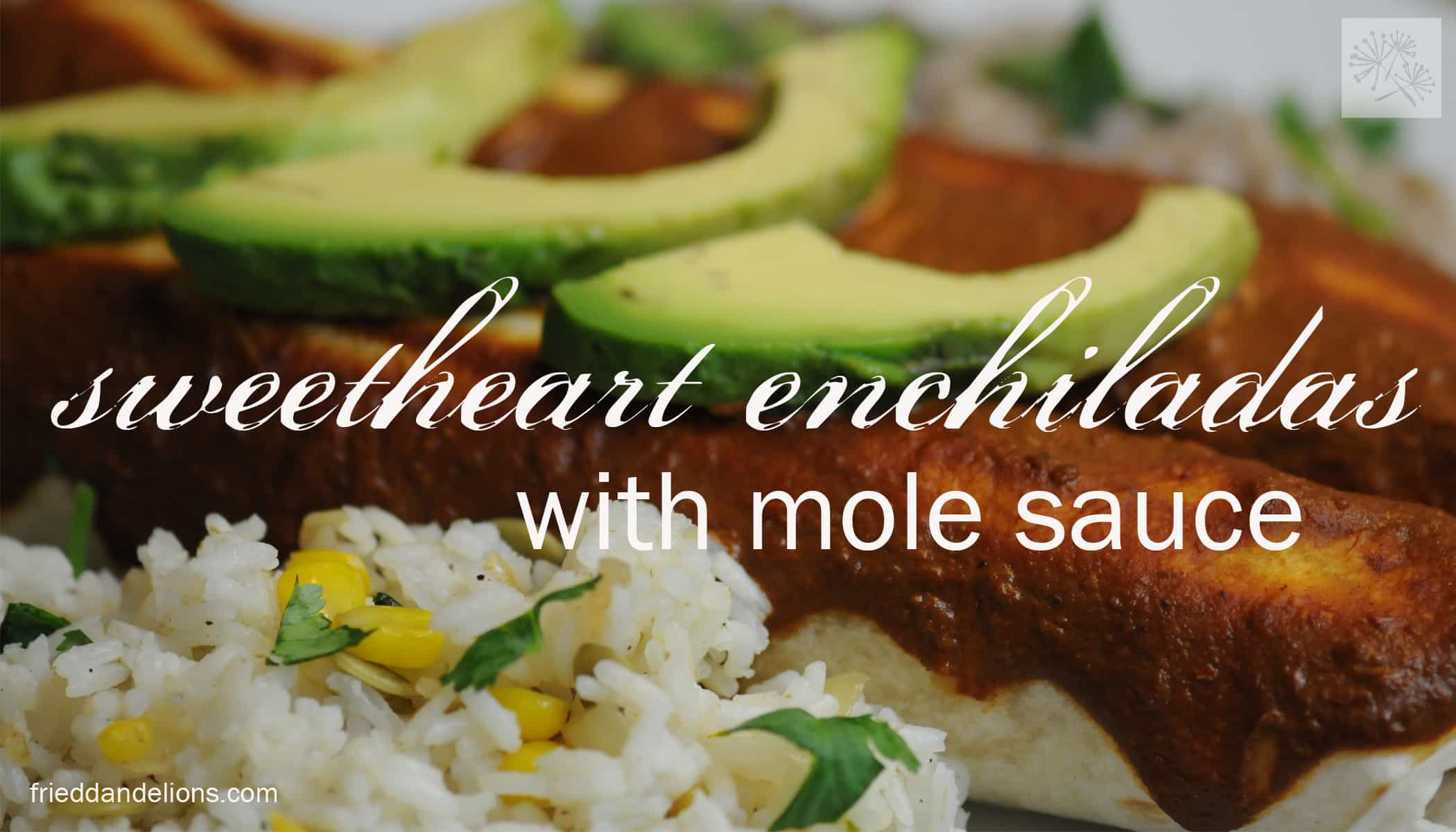 Tonight I made my boys a pre-Valentine dinner of Sweetheart Enchiladas, non-fried refried beans, and a simple rice pilaf. Irving had seconds, David had thirds, and I was happy to see my boys enjoying the fruits of my afternoon cooking. The beans were simple—pinto beans sautéed with garlic, cumin, and olive oil, and smashed until the consistency of refried beans. I mixed plain white rice with sautéed onions, garlic, frozen corn, pepitas, and cilantro. The main attraction was the Sweetheart Enchiladas—roasted sweet potatoes, sweet plantains, cauliflower and onions rolled in tortillas and smothered in a sweet chocolate apricot mole sauce—pronounced mol-ay. This sauce is so yummy that I spent much of the afternoon dipping tortilla chips into it!