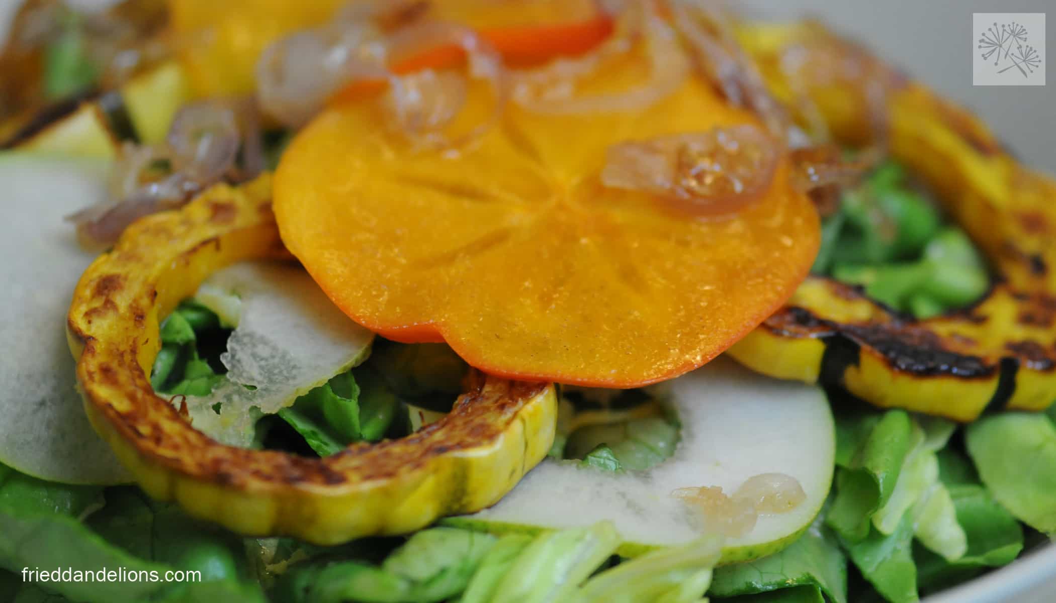I’m also going to be making this Delicata Persimmon salad, which I’ve adapted from a recipe I found during the Virtual Vegan Potluck.
