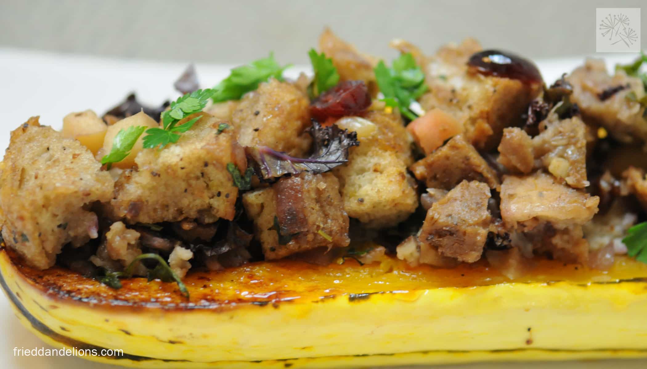 For a simple main dish, stuff your stuffing into roasted, halved delicata squash.