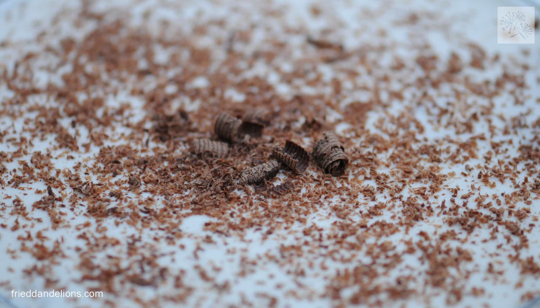 Now repeat until you have used all of your ingredients and filled your dish. On the top layer, make some extra fancy garnishes by using your vegetable peeler to scrape along the chocolate bar.