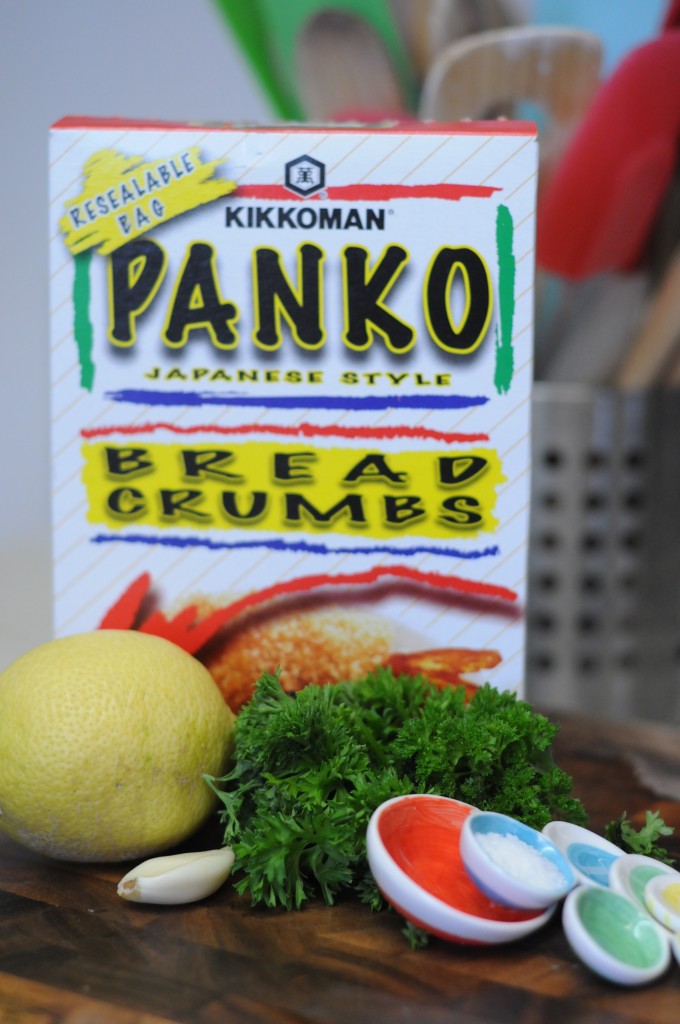Heat olive oil over medium low heat in small pan. Add garlic and cook, but do not burn! Add panko bread crumbs and stir thoroughly. Add parsley, lemon zest, salt and pepper and stir well, browning the bread crumbs slightly. Remove from heat and follow directions above.