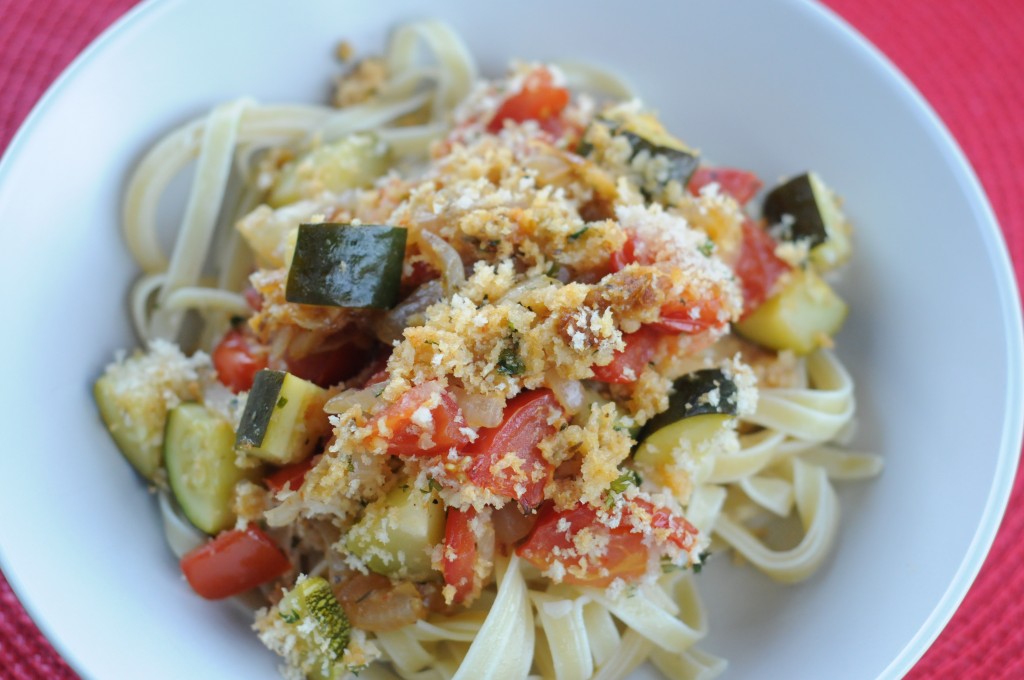 Cut tomatoes into 1 inch pieces. If you use grape or cherry tomatoes just cut them in half. Cut zucchini to same size. Add garlic, thyme, salt, and pepper to onions and stir to combine. Add flour and stir to coat all onions, let cook for a minute to cook out raw flavor. Add tomatoes and zucchini and mix well. Cook over medium low heat for 5 minutes. Transfer all contents of pan into a baking dish. Spread bread crumb topping evenly over vegetables. Place in oven and cook for 20 – 30 minutes, or until zucchini is tender, watching carefully so the bread crumbs don’t burn. Cover with foil once crumbs brown if zucchini still needs time.