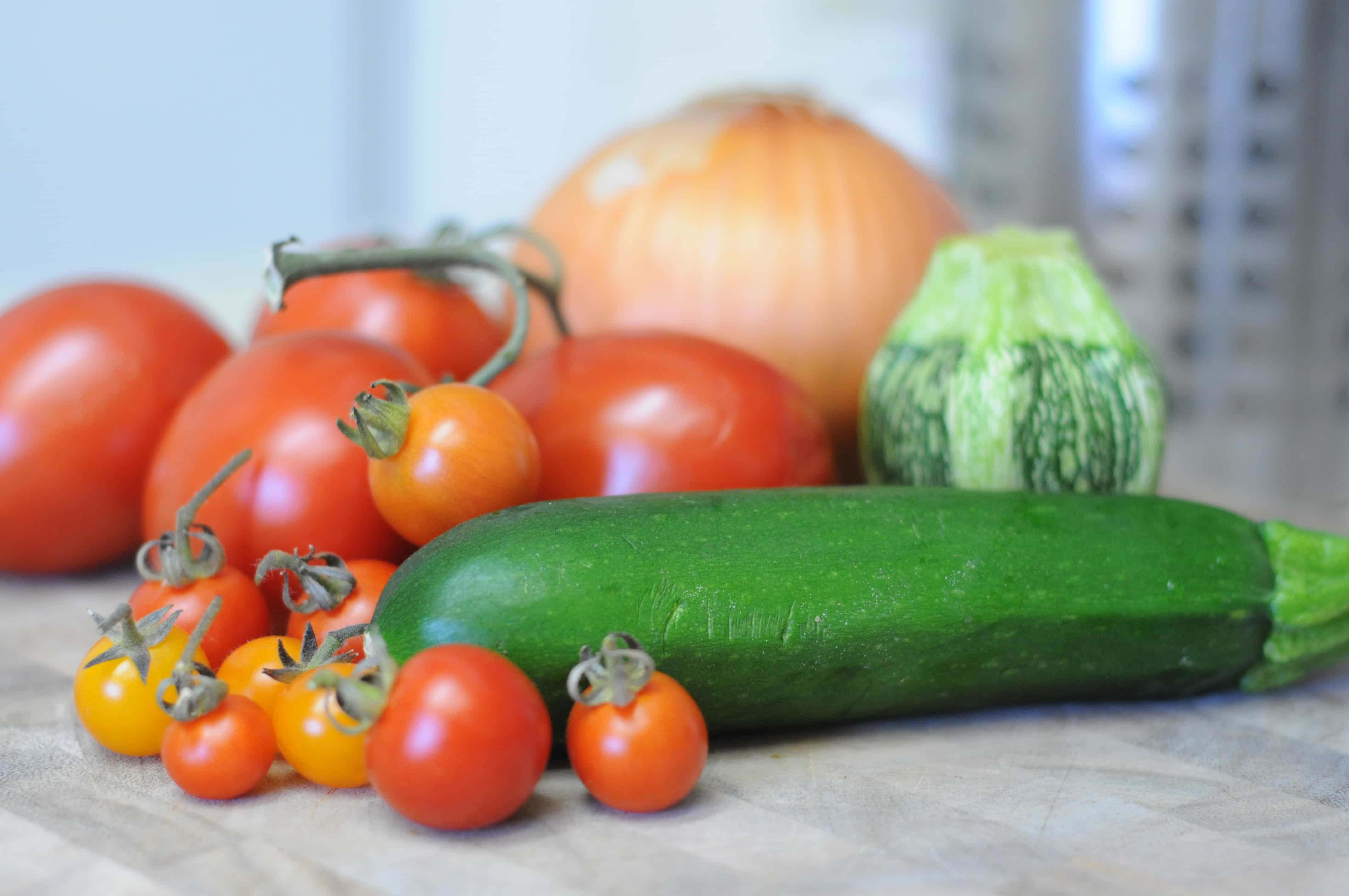 ~1 pound of tomatoes, grape or cherry size work well, but I used a mix of roma and whatever I found ripe in the garden…the end result is delicious, but a uniform size makes a prettier presentation
