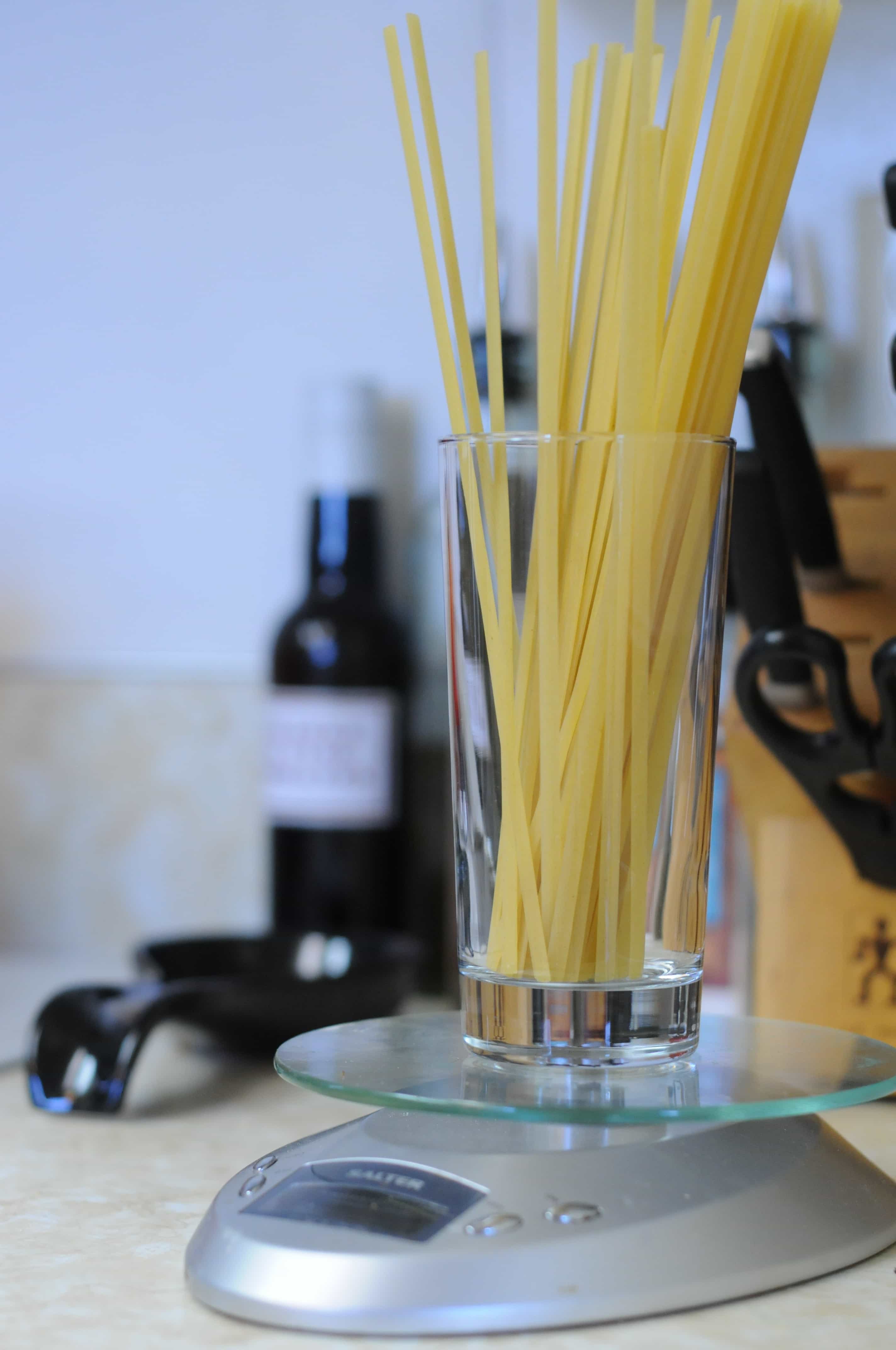 Put a pot of water on for your pasta sometime during the vegetable prep, depending on how long it takes your stove to bring water to boil. I weigh my pasta because left to my own devices I would probably eat 4 servings on my own! Once pasta is cooked, pour into strainer. Put 1 tsp olive oil in the pasta pan with 1 clove minced garlic and cook for just a minute. Add pasta back in to pot and toss well to coat lightly.