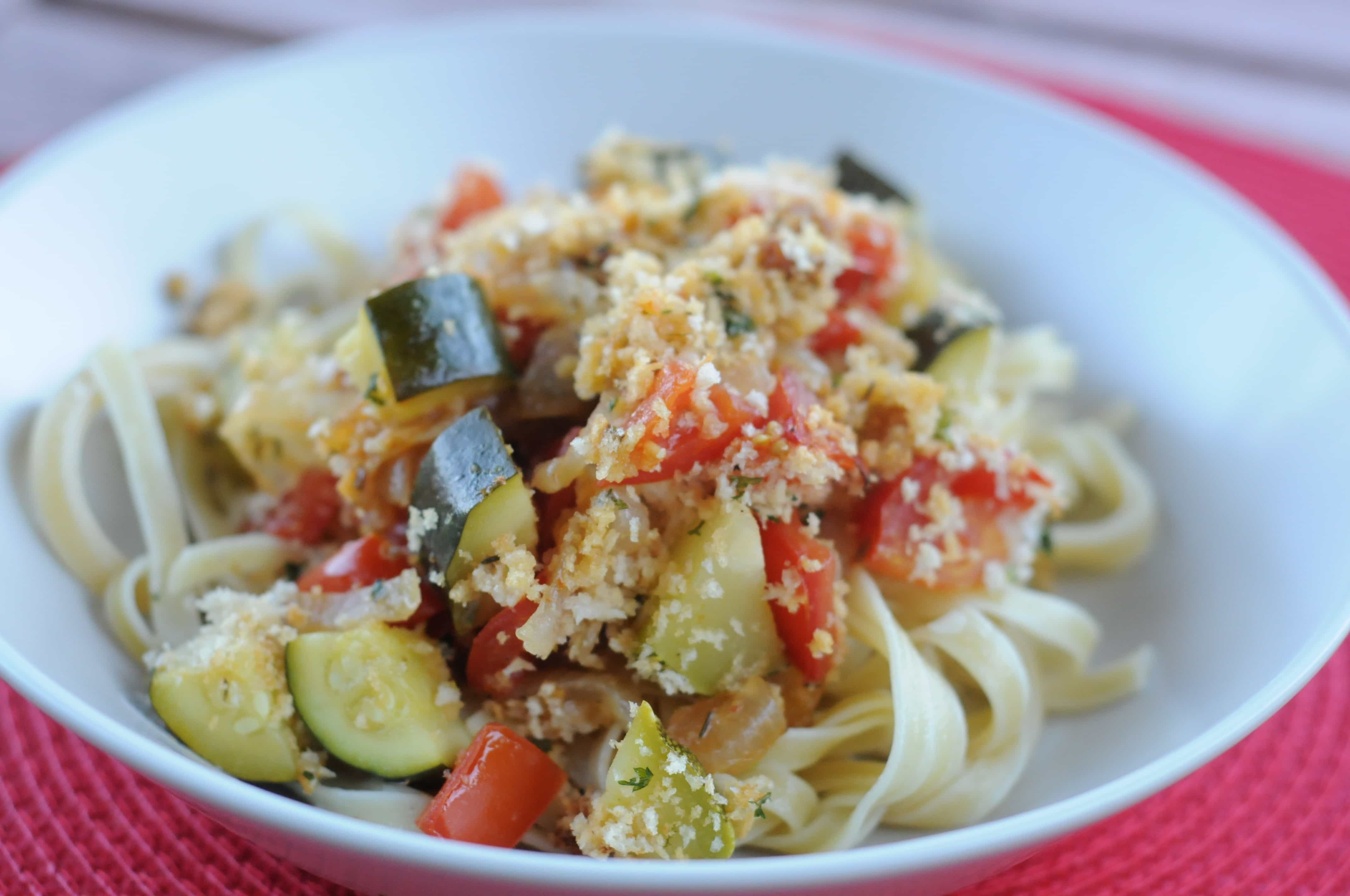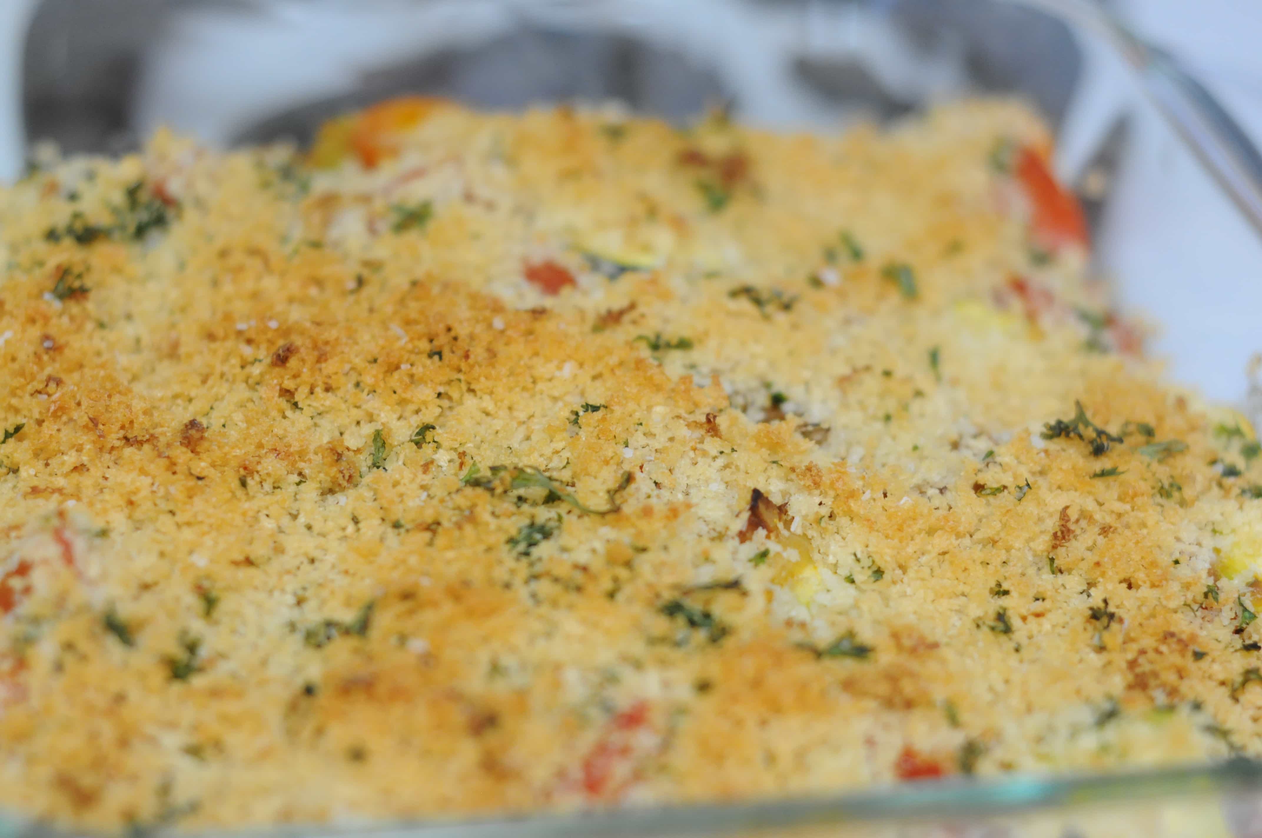 Cut tomatoes into 1 inch pieces. If you use grape or cherry tomatoes just cut them in half. Cut zucchini to same size. Add garlic, thyme, salt, and pepper to onions and stir to combine. Add flour and stir to coat all onions, let cook for a minute to cook out raw flavor. Add tomatoes and zucchini and mix well. Cook over medium low heat for 5 minutes. Transfer all contents of pan into a baking dish. Spread bread crumb topping evenly over vegetables. Place in oven and cook for 20 – 30 minutes, or until zucchini is tender, watching carefully so the bread crumbs don’t burn. Cover with foil once crumbs brown if zucchini still needs time.